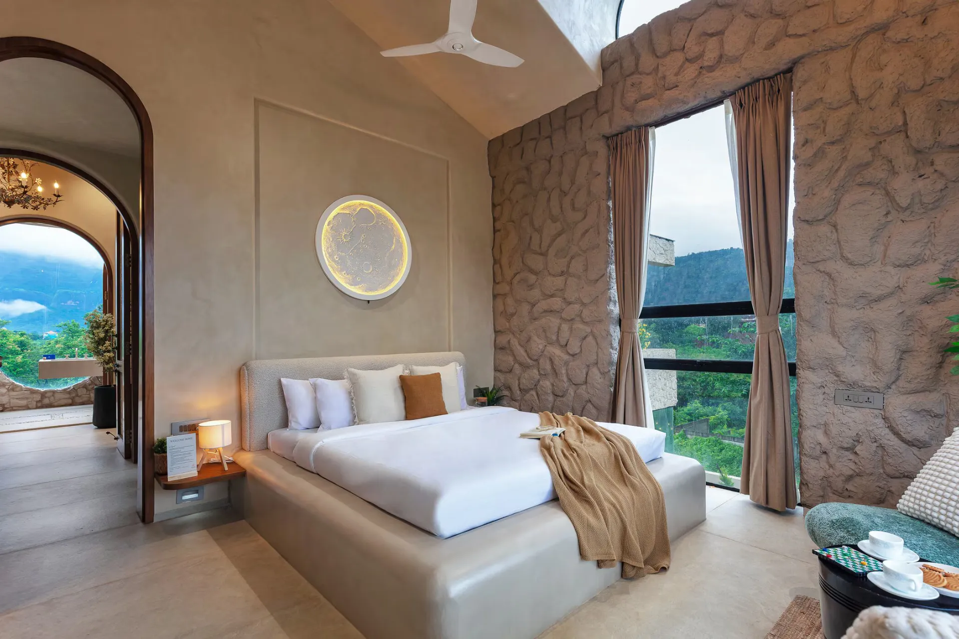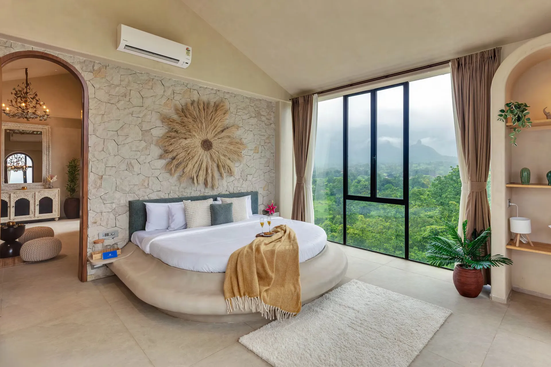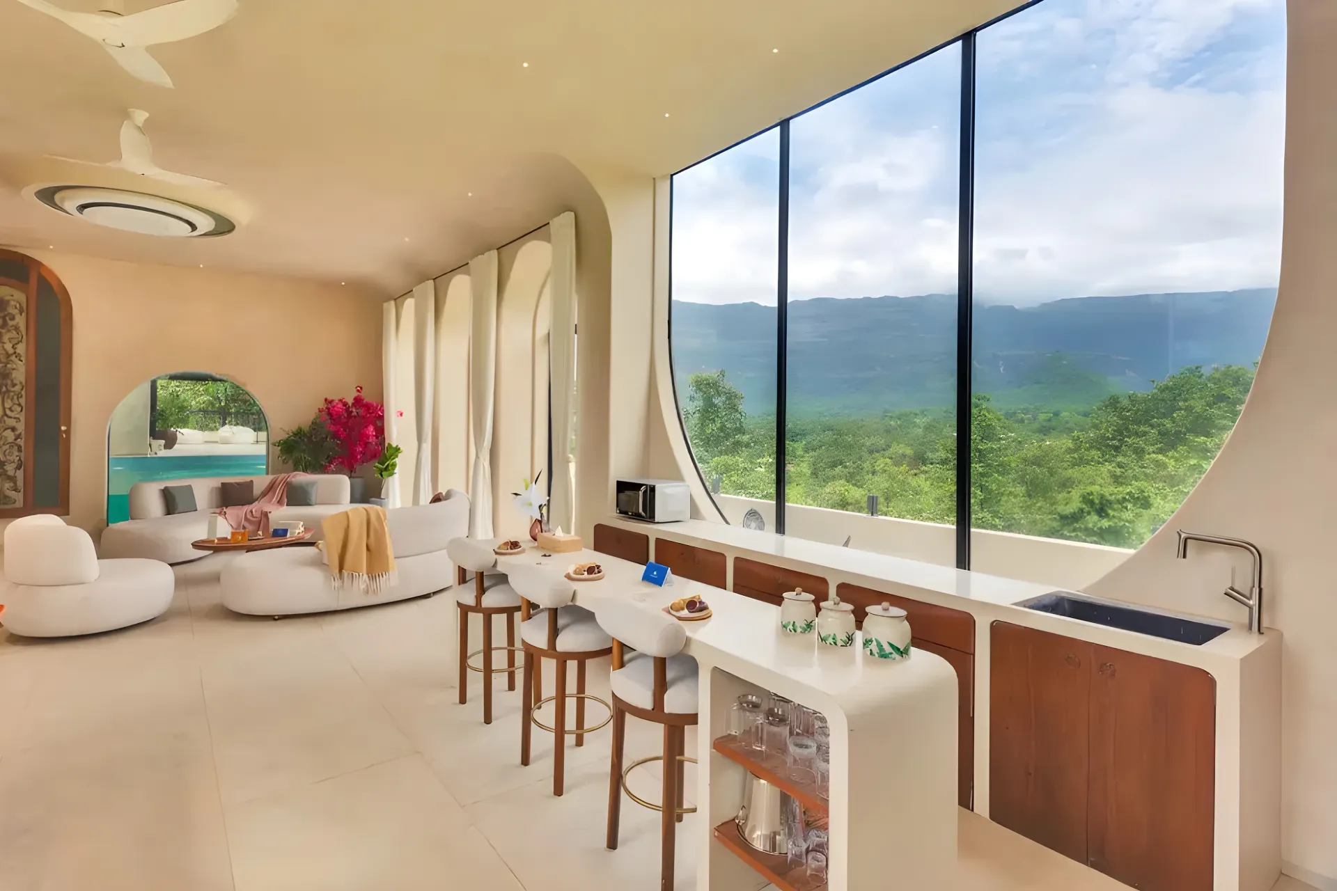 Located merely 2 hours from Mumbai, VODMH414 Villa is a 5 BHK Villa With Jacuzzi In Karjat, designed with a European theme that evokes the essence of Spain. Envision arched stone doorways, impeccably styled interiors reminiscent of Pinterest, and bathrooms featuring bathtubs that offer unobstructed views of the mountains.
