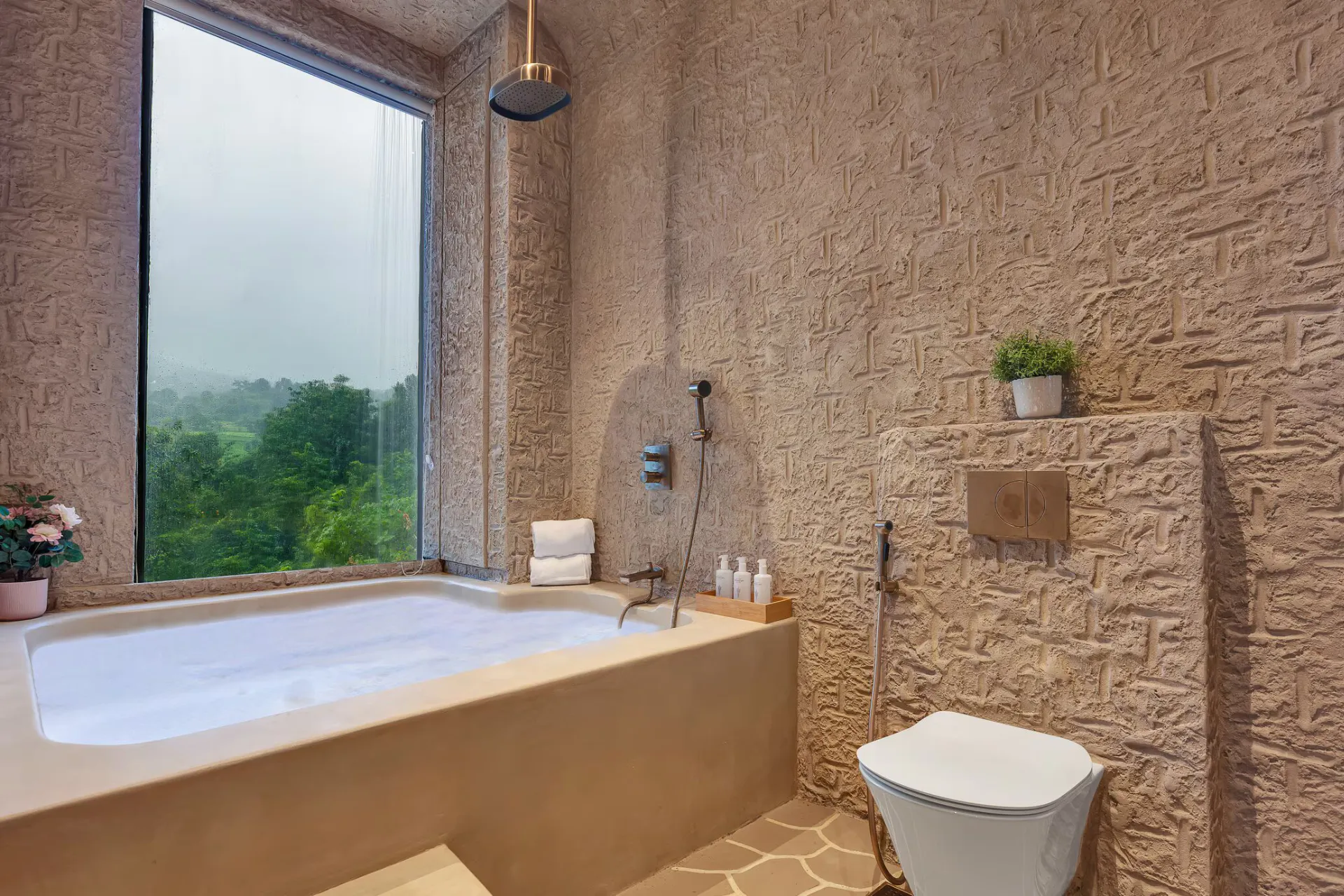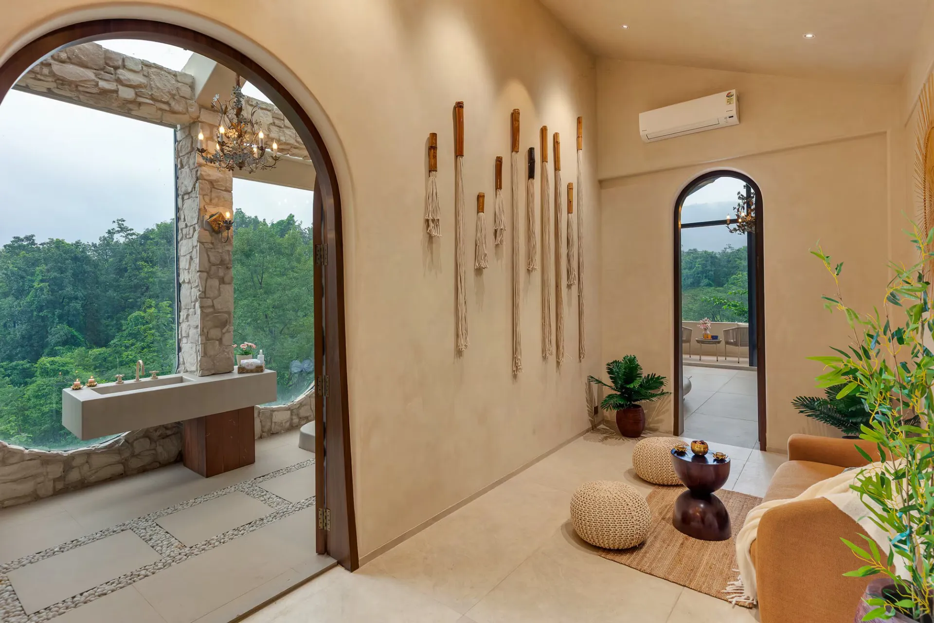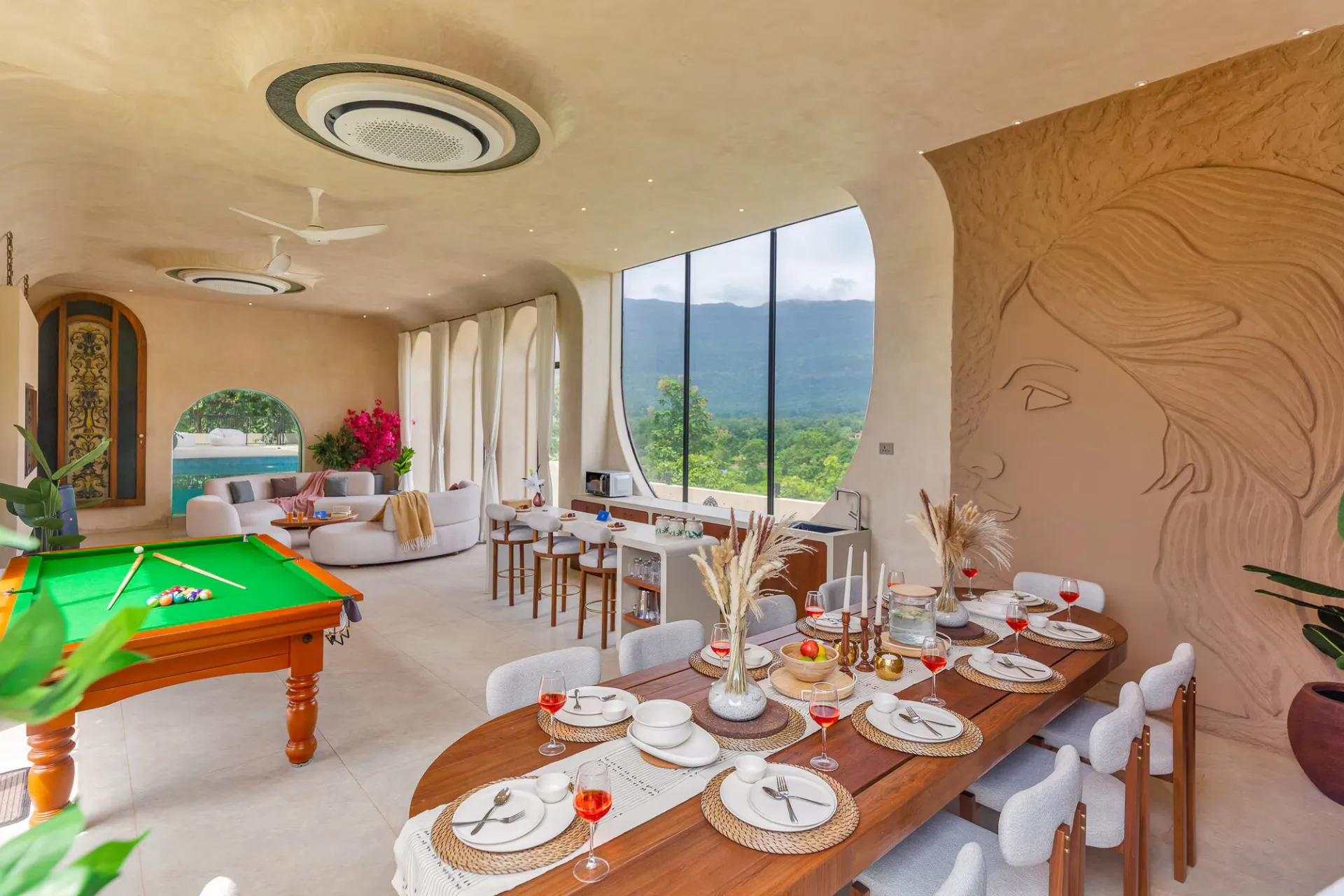 Located merely 2 hours from Mumbai, VODMH414 Villa is a 5 BHK Villa With Jacuzzi In Karjat, designed with a European theme that evokes the essence of Spain. Envision arched stone doorways, impeccably styled interiors reminiscent of Pinterest, and bathrooms featuring bathtubs that offer unobstructed views of the mountains.