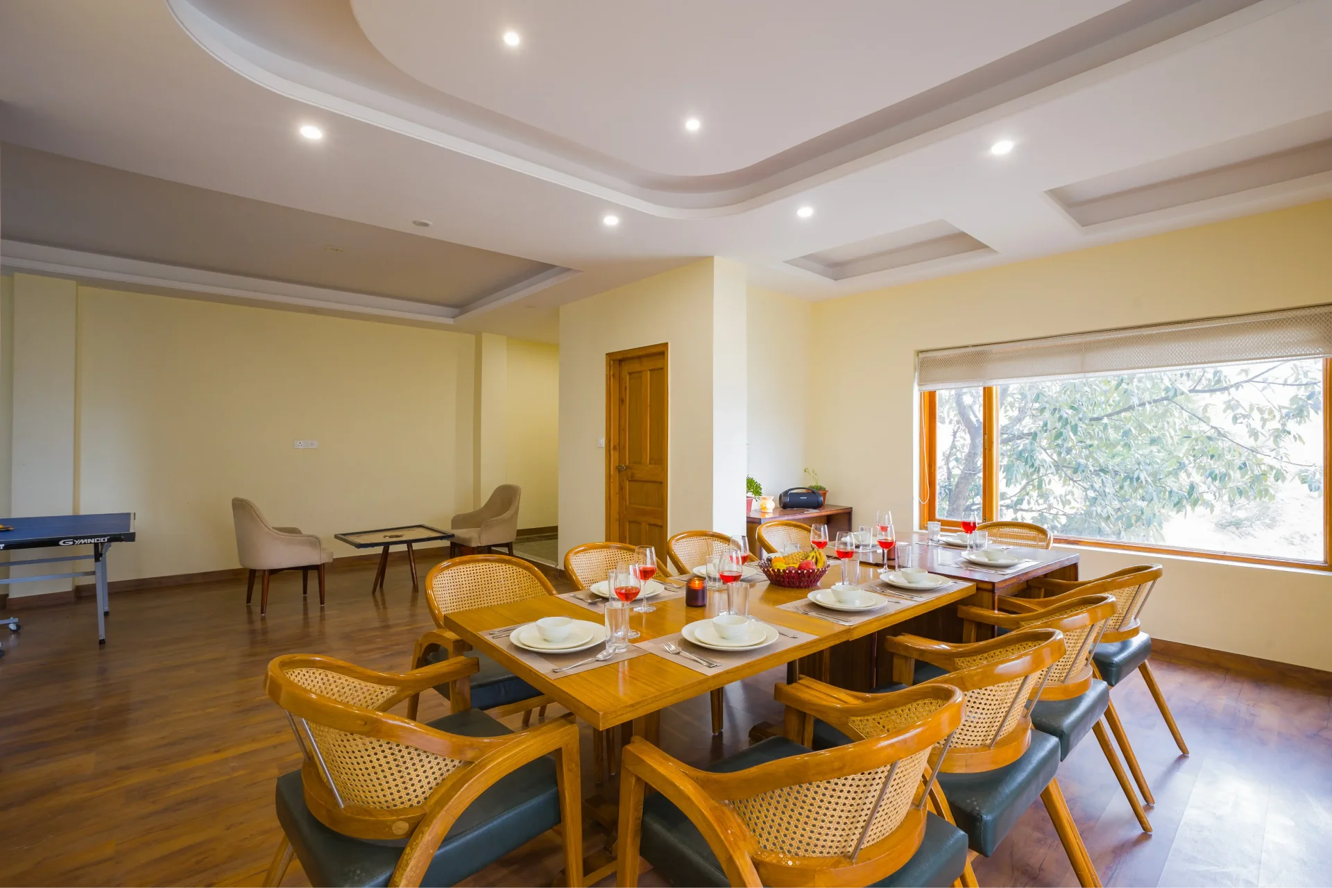5 BHK Villa With Lounge In Shimla, a spacious balcony adorned with a wooden ceiling and stylish seating offers a view of the tranquil landscape, making it an ideal place to relax. Its semi-open layout fosters a peaceful retreat, perfect for unwinding or savoring the fresh mountain air. The lounge area is tailored for leisure, equipped with a table tennis setup and a carrom board for endless entertainment. Nearby, plush beige loungers provide a cozy spot to curl up with a book and relish the serene atmosphere. The property features a 24-hour front desk and room service available for guests. In the hotel rooms, amenities include air conditioning and a flat-screen TV.