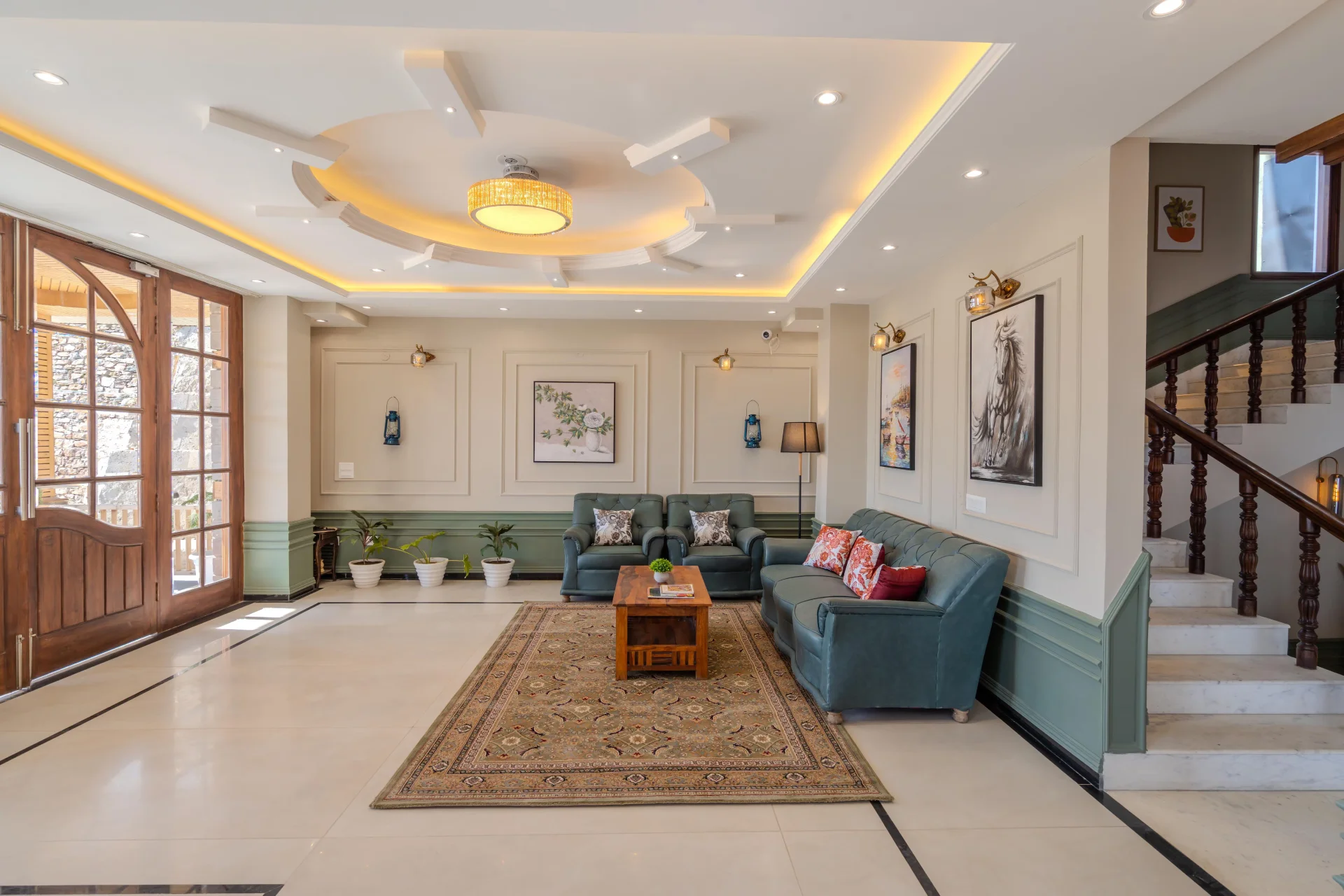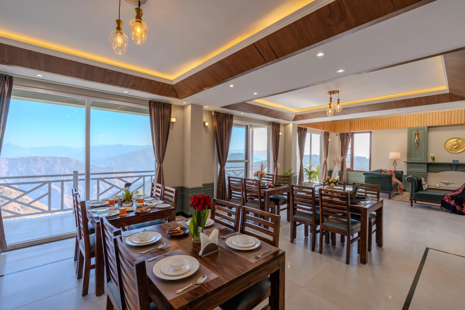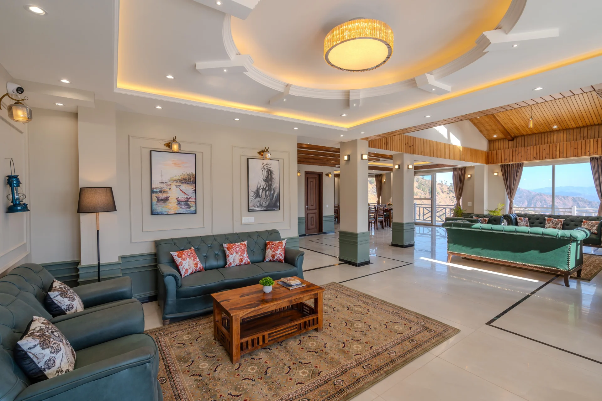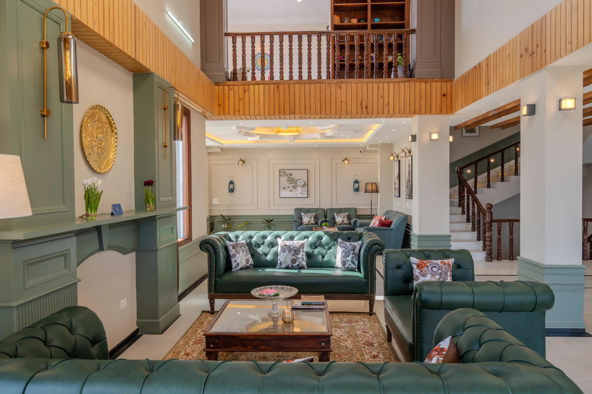 6 Bedroom Valley View Villa In Shimla Enjoy sweeping views of the valley from VODHP28 Villa. This residence combines British architectural elements with contemporary European design, situated within verdant surroundings and providing stunning sunrises from its expansive bedrooms.