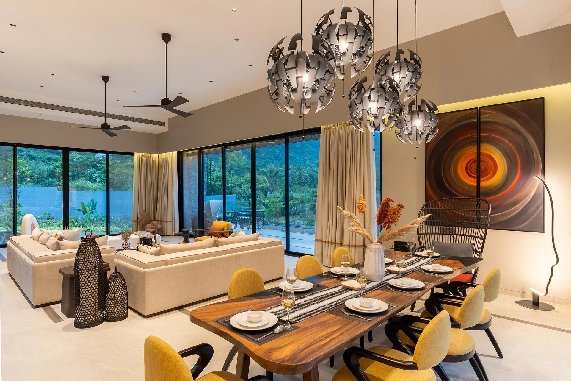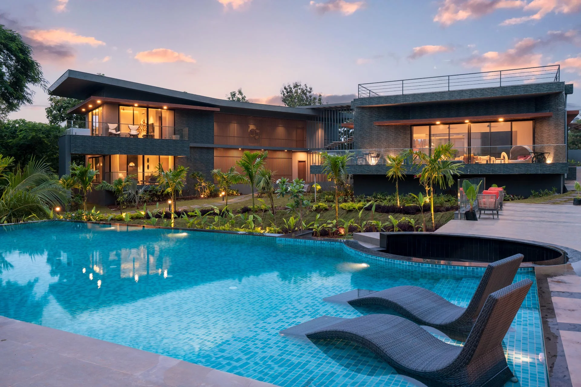 6 BHK Mountain View Villa VODMH165 Villa is an exquisite residence located in Alibaug, providing a lavish retreat with enveloped by verdant foliage and majestic palm trees. This magnificent dwelling offers breathtaking views of the mountains.
