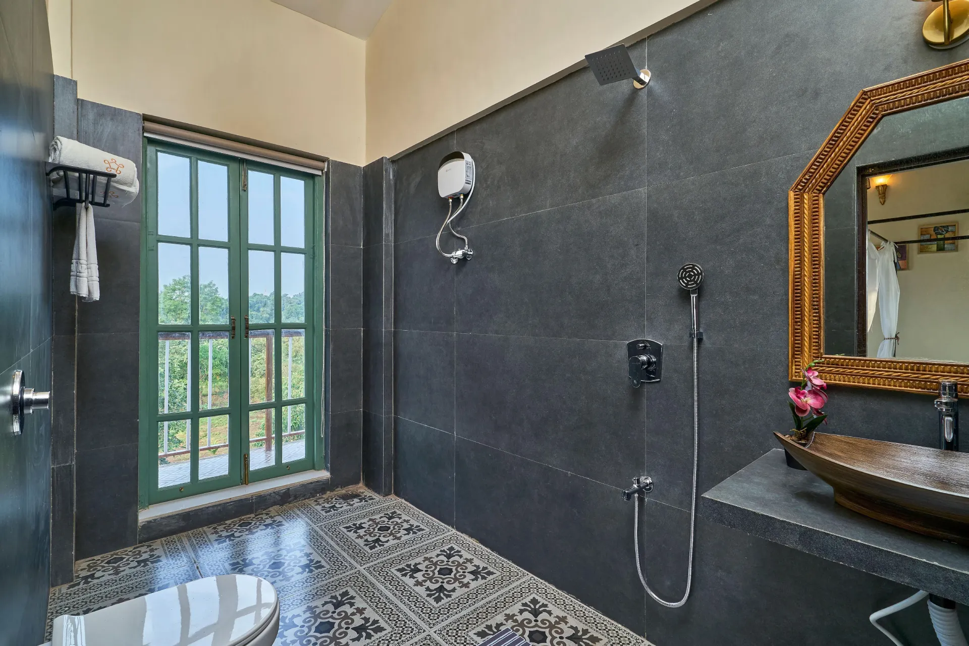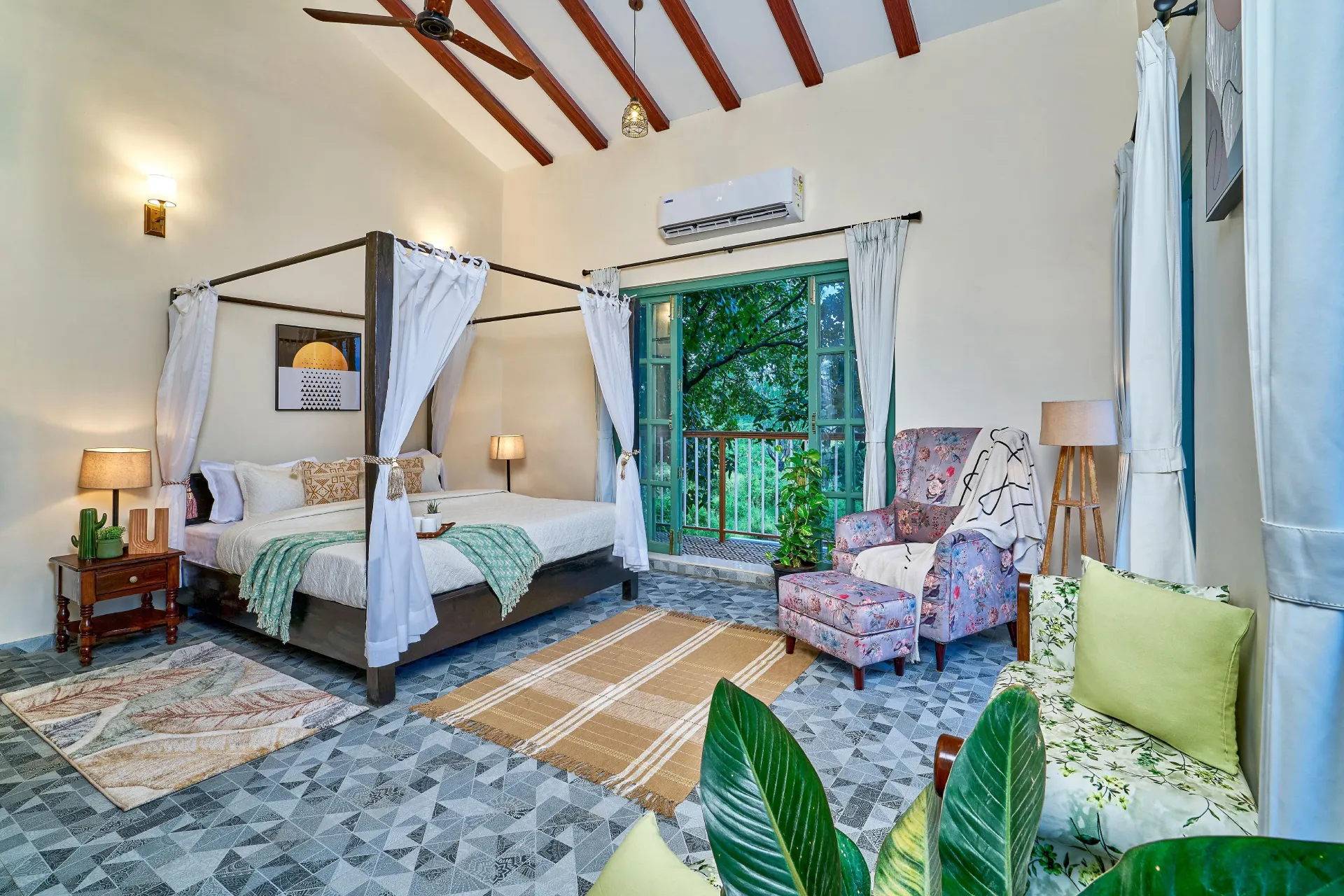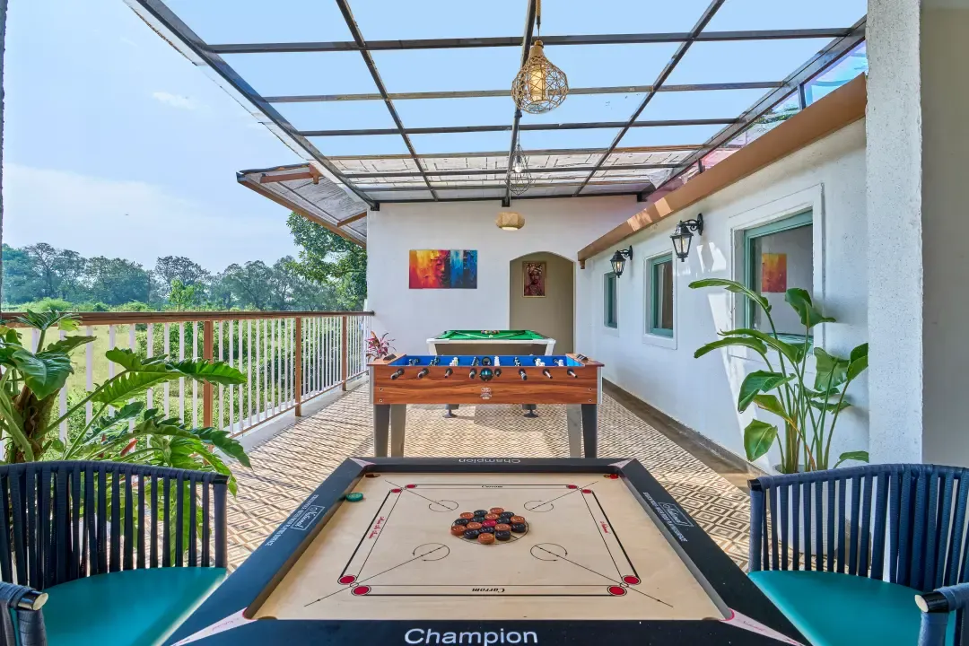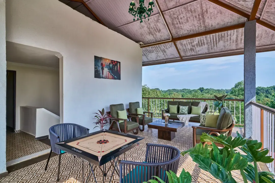 Immerse yourself in the enchanting allure of VODMH413 Villa 6 BHK Pet Friendly Villa In Karjat , a breathtaking Indo-Portuguese residence located in Karjat, alongside the tranquil Pej River. Set on 2 acres of verdant tropical terrain, this completely pet-friendly haven harmoniously combines classic Portuguese sophistication with the laid-back spirit of Goa.