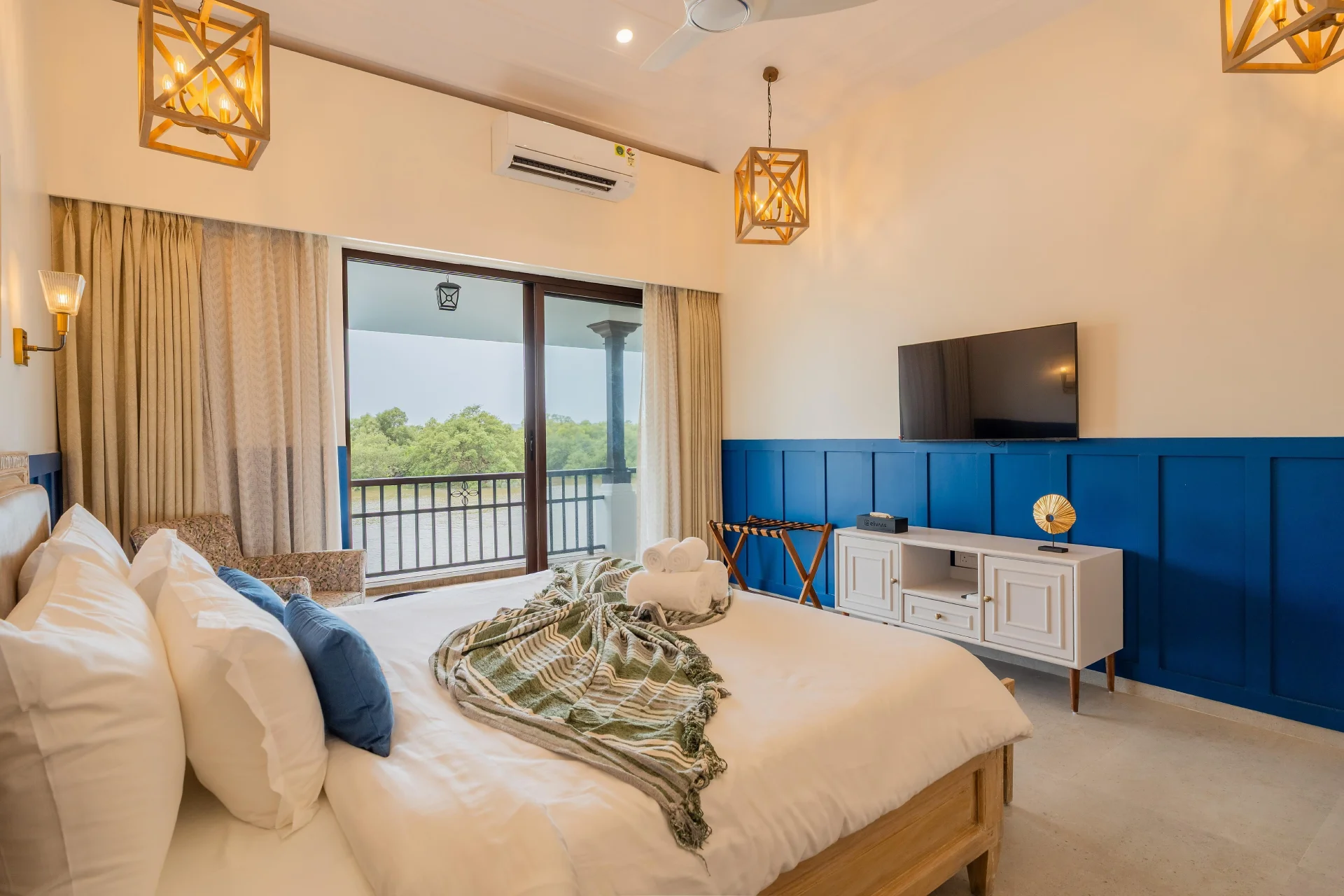 VODGA122 Villa in Goa features six bedrooms and seven bathrooms, along with a living room. The property boasts a balcony that offers river views, ensuring a pleasant stay. Guests benefit from complimentary WiFi, air conditioning, and a fully equipped kitchen. The villa also includes a private pool, television, and free on-site private parking. Each of the six bedrooms serves as a private retreat, adorned with natural materials, handcrafted furnishings, and floor-to-ceiling glass that invites the surrounding greenery inside. Select rooms feature bathtubs, providing an additional layer of tranquility, while every room includes a river-facing balcony that offers the gift of complete serenity.