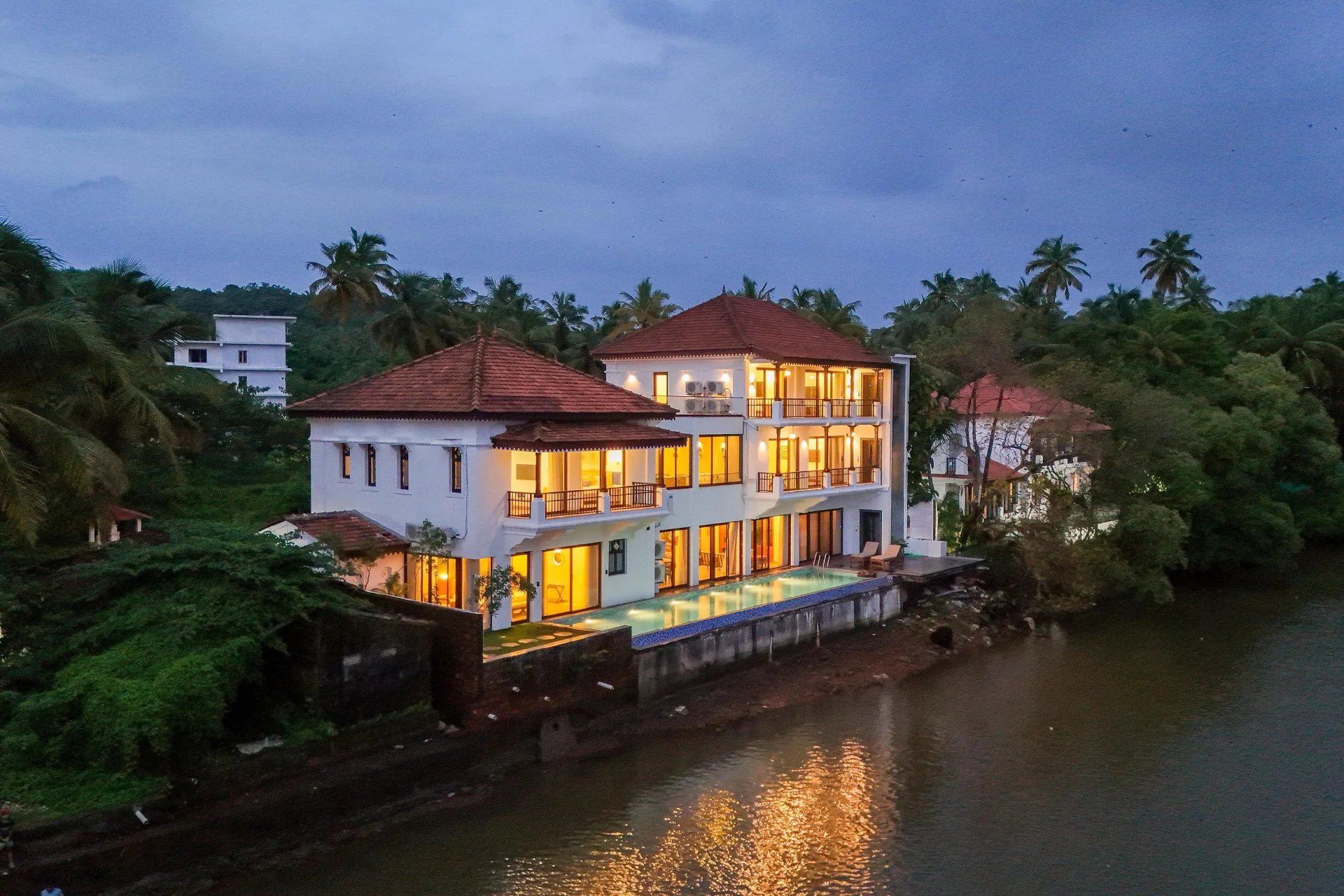 6 BHK Villa With Infinity Pool In North Goa Upon entering, a profound sense of tranquility envelops you, as though the clamor of the outside world has been muted to a mere whisper. Each detail appears intentional, thoughtfully arranged, and subtly assured. It mirrors the shifting sky above & blurs the boundary between land & water.