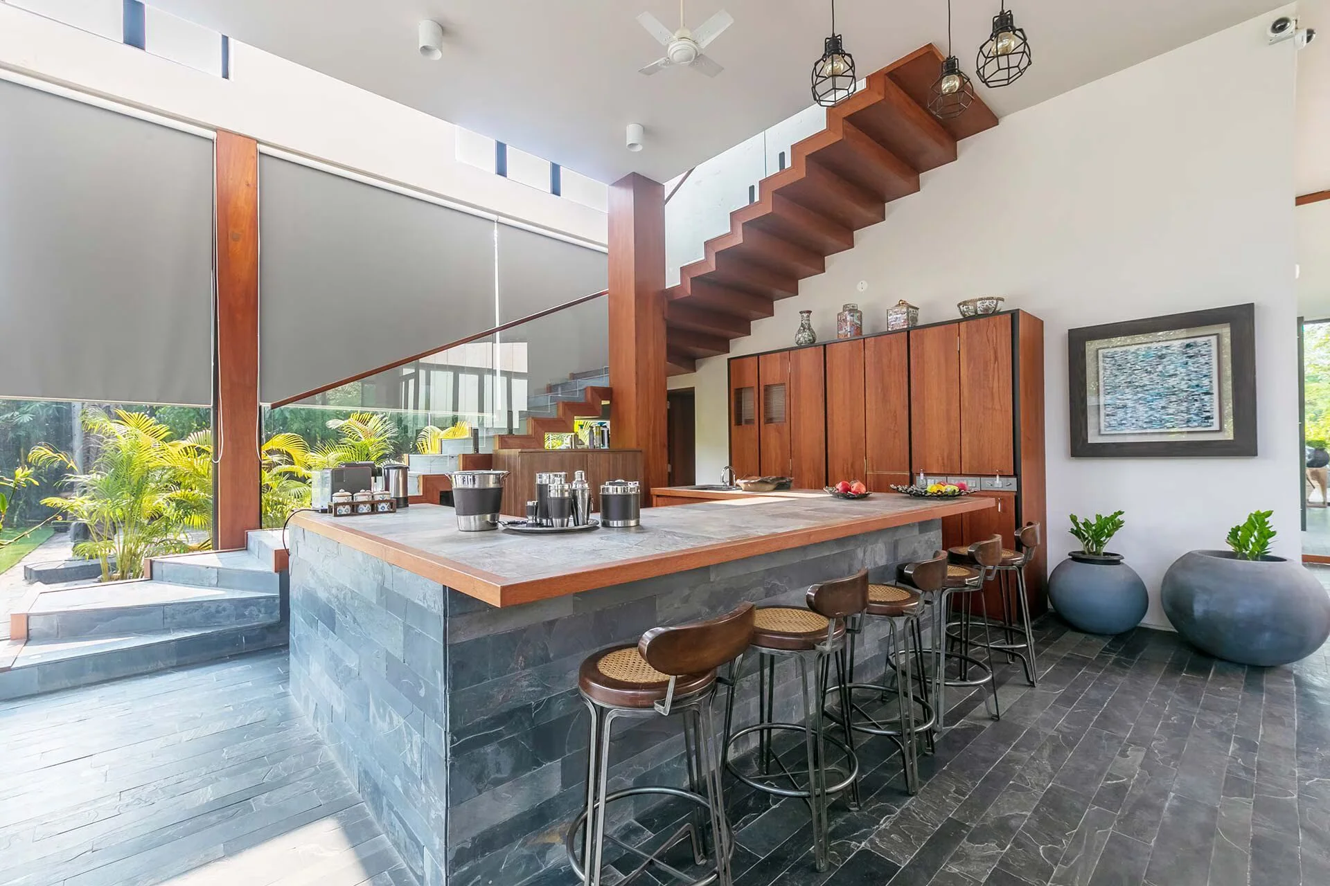 6 Rooms Villa With Pool Featuring a stunning contemporary facade and opulent interiors, VODMH208 Villa represents the pinnacle of a vacation getaway. Situated just a few hours from the city and a mere 10 minutes from Mandwa Jetty, this expansive estate is perfect for enjoying quality time with your family and friends.