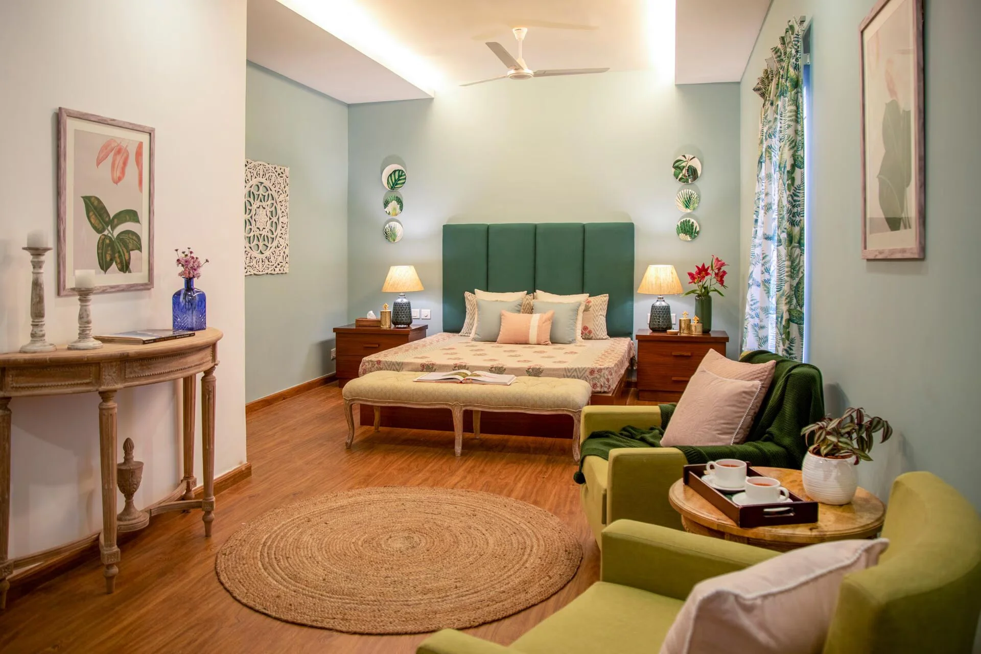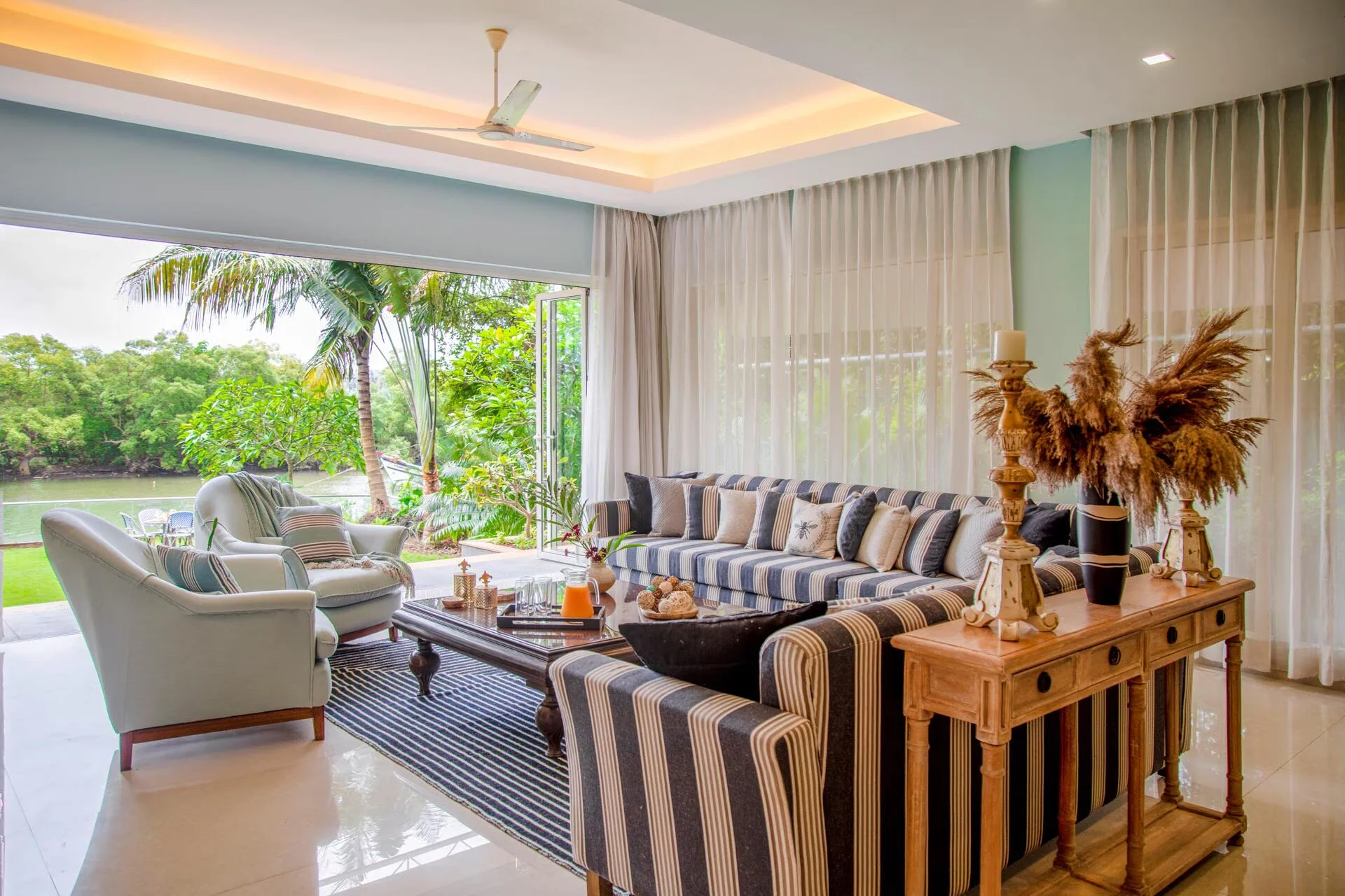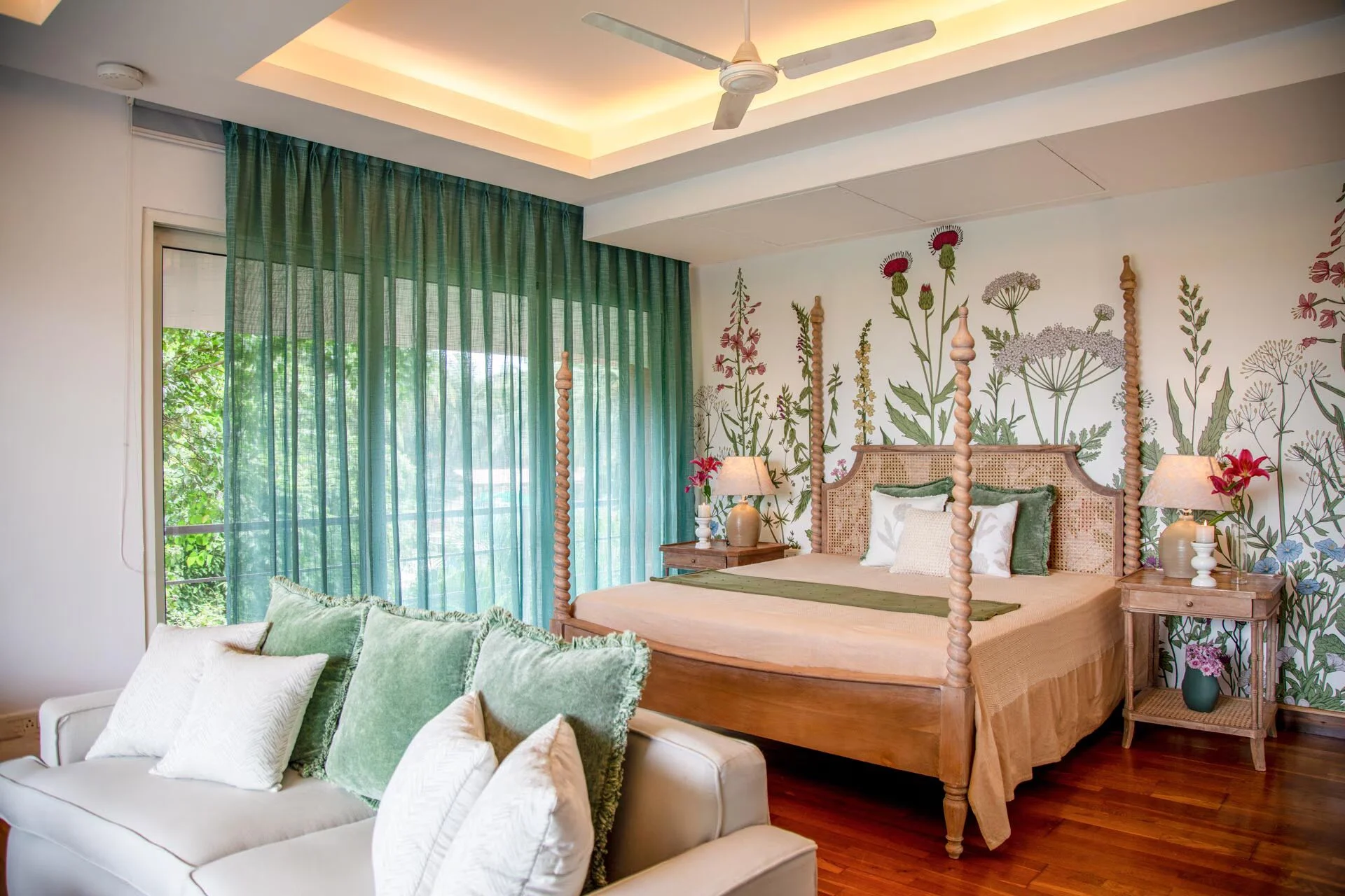 The contemporary seven-bedroom villa boasts an impressive array of amenities, including a private elevator, a drop-in tub, a fully equipped entertainment room, and a private jetty. The stunning riverside garden is bound to bring joy, but the highlight is undoubtedly the rooftop private pool, which offers unparalleled views of the lush landscape and meandering river. The spacious living and dining area, along with the cozy bedrooms and intimate lounge, are brought to life with vibrant colors and eclectic prints.