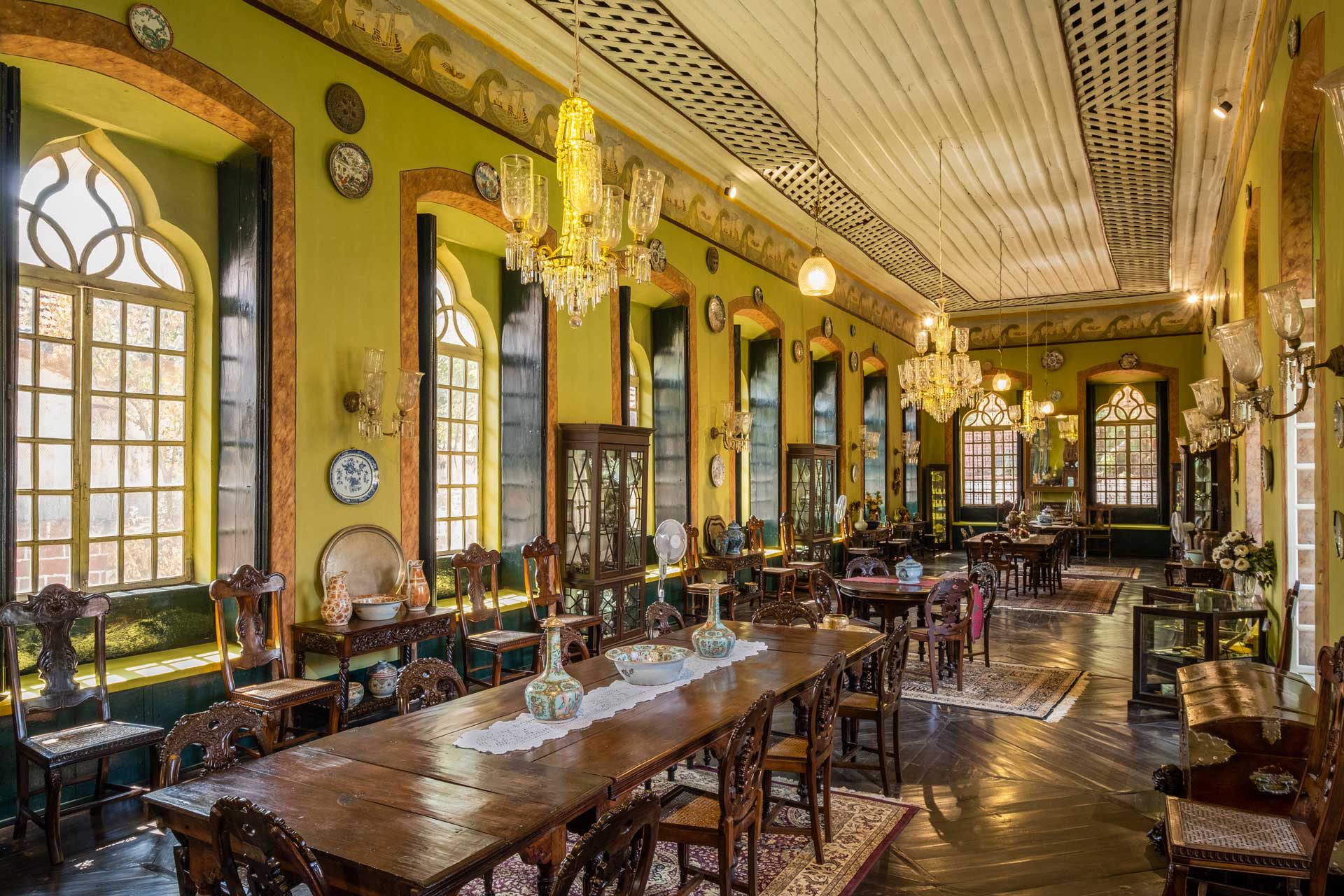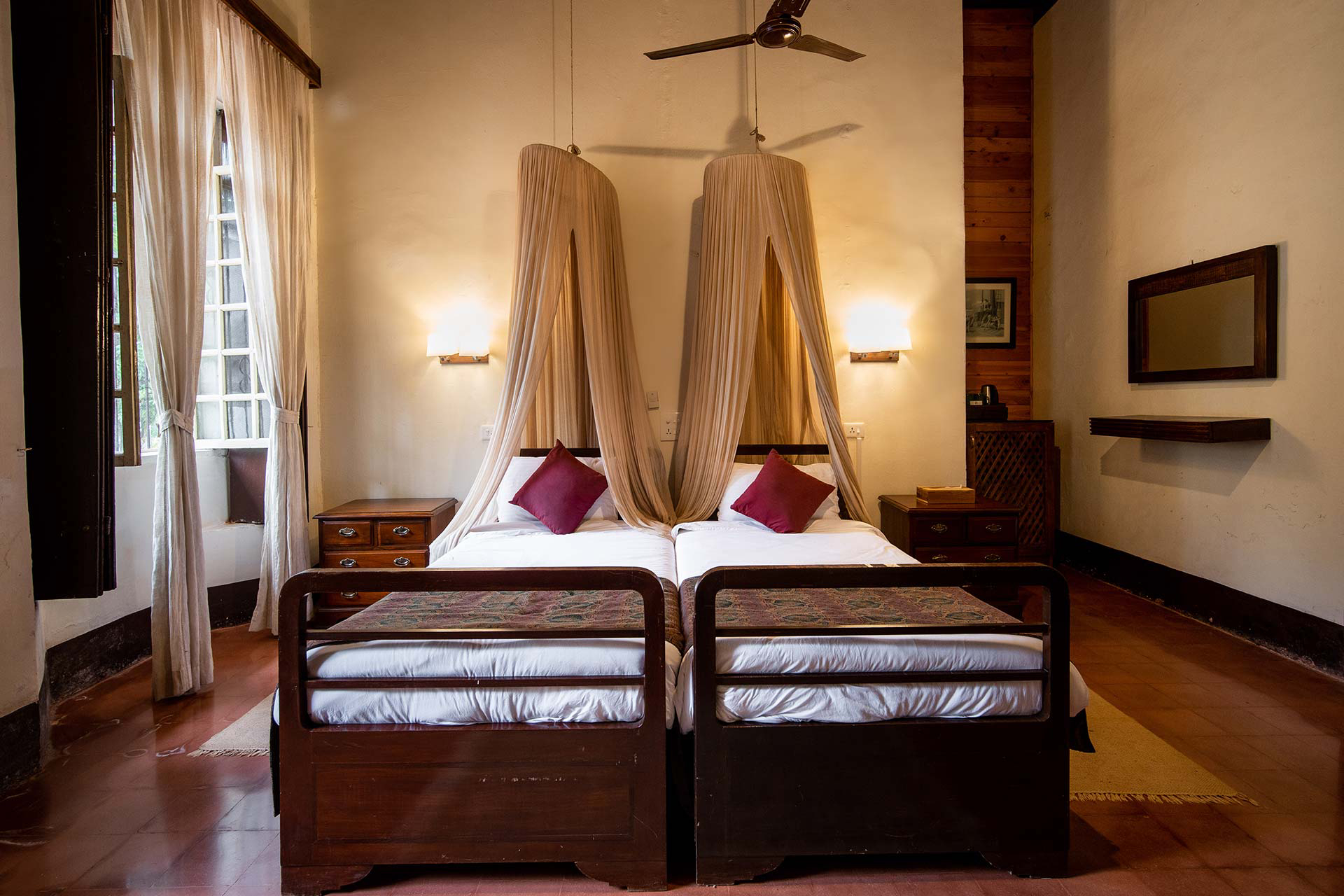 The original architects of this regal house, and later the Jesuit priests who designed the noem ghor, assisted by the keen creative eye of the present owner, have crafted this intricate wonder, where every nook exudes comfort, luxury, and bliss. The house’s extravagant interiors and grand 2 staircase facade stand in studied stillness, towering over the natural beauty that stretches as far as the eye can see. Antique teakwood furniture crafted by artisans and carvers from Goa and abroad, as India was in those times commissioned porcelain engraved with the family crest and initials, Italian floor tiles over 200 years old there are just some of the visible markers of the splendour in which the house and its occupants lived.