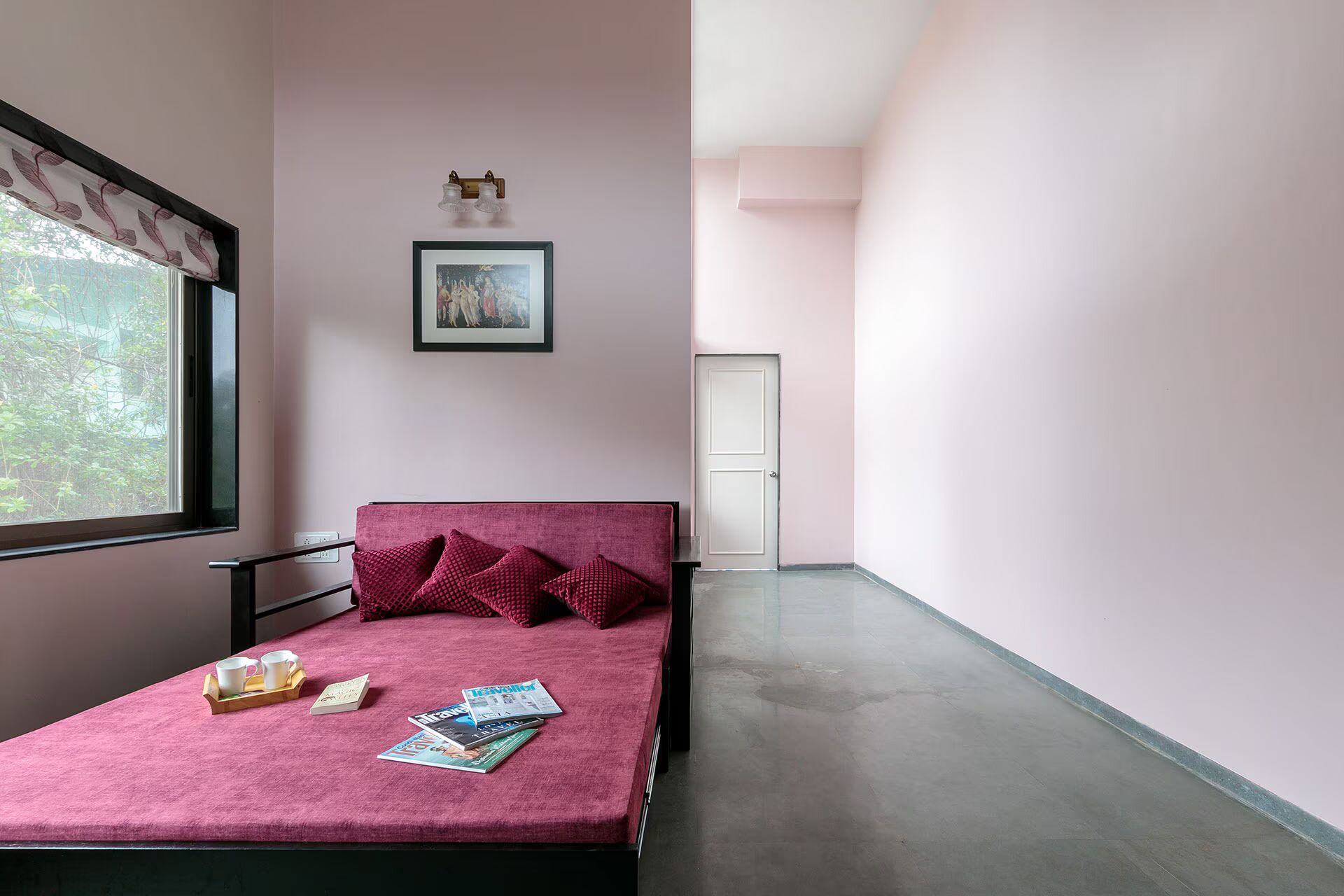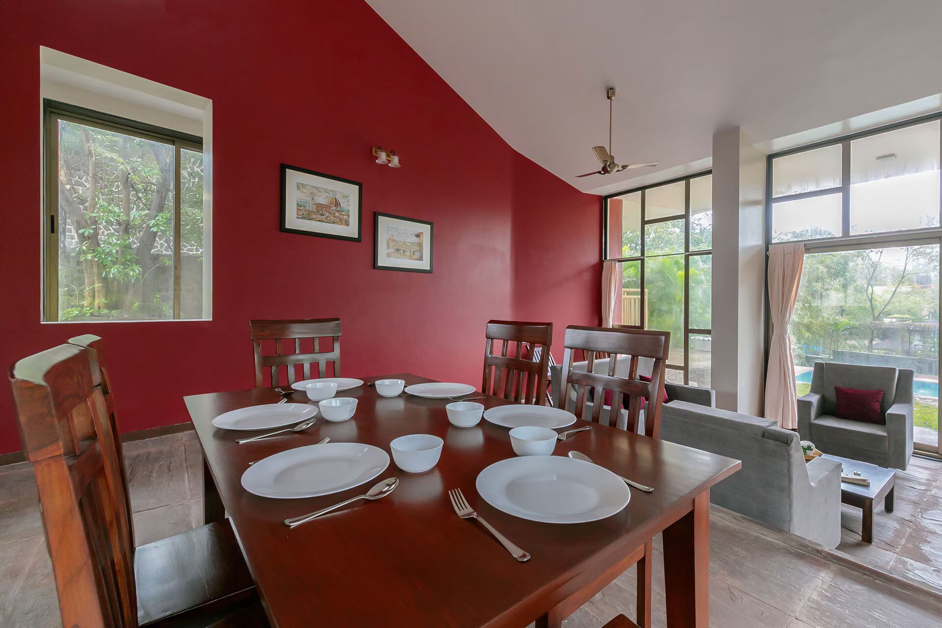 Elegant 3 bhk hill view villa in lonavala, VODMH60 villa serves as an ideal vacation residence, featuring inviting interiors, a swimming pool, and a desirable location surrounded by nature. The striking, accent walls contribute a sense of opulence to an otherwise tranquil and laid back environment.