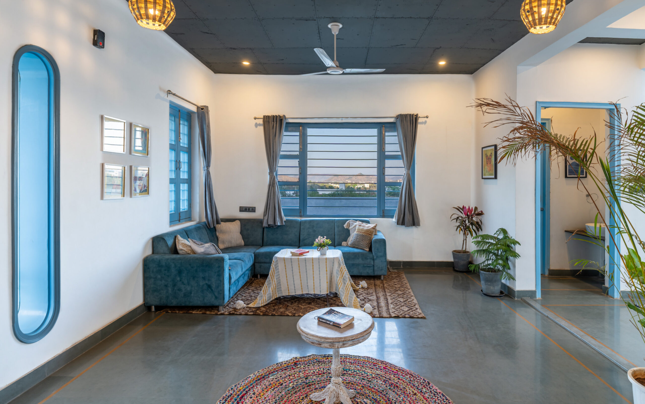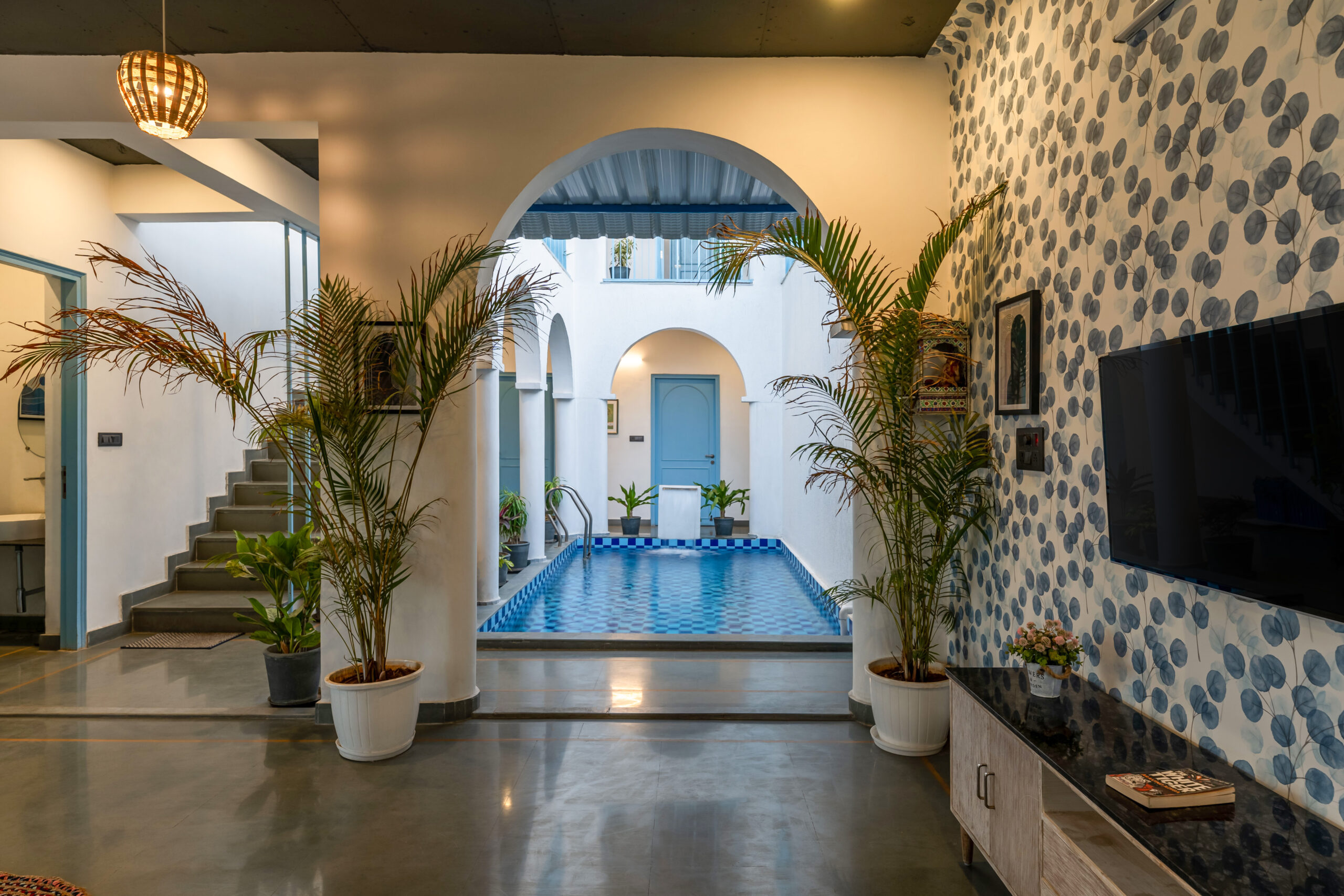 Luxurious 6 bedrooms greek villa amid the Aravalli hills, just 10 minutes from the world famous Lake Fatehsagar. The villa is situated in a serene location, featuring huge luxurious bedrooms with attached bathrooms, a well equipped kitchen, and rooftop seating arrangements. Furthermore, there is a courtyard pool in the yard to enjoy some pool time and a small cozy garden space. Udaipur is truly an exquisite city with ample natural splendor set at every nook and corner. It is amidst the stunning Aravali Ranges of Rajasthan, India, and known for its vivid fine looking lakes, also called ‘the city of lakes’.