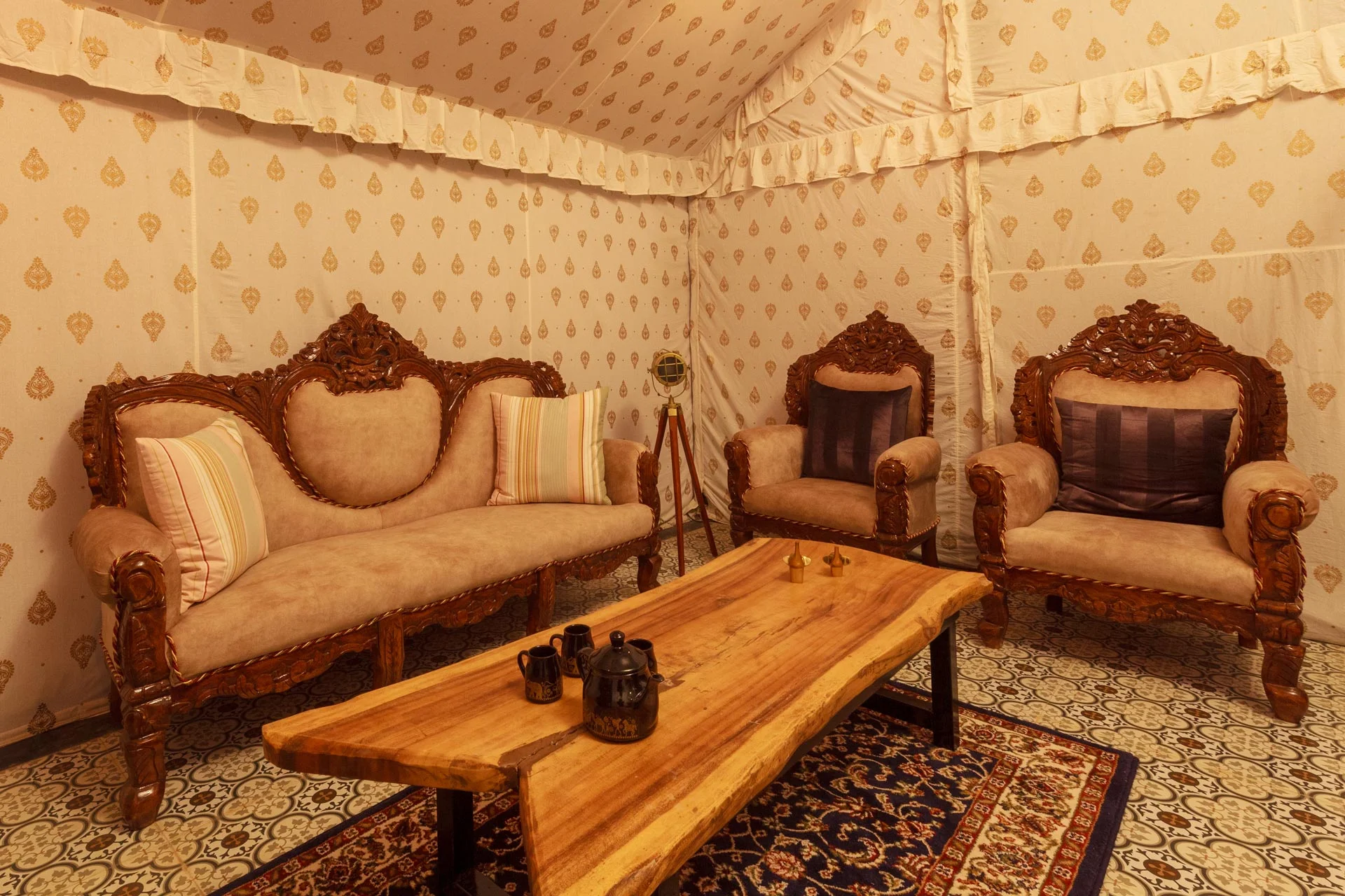 This estate offers a Karjat unique blend of comfort and natural beauty. Experience the royal ambiance within this expansive tent, which is furnished with elegant vintage pieces and classic decor. It includes a foldable bed, air conditioning, a television, a generous wardrobe, a fireplace, seating options, and the practicality of an electric kettle. Additionally, the tent features a compact ensuite bathroom. There is an ensuite bathroom designed for the comfort of guests. Each bathroom features a geyser, towels, and essential toiletries for the convenience of the guests. Savor the delicious local cuisine and reconnect with your loved ones in the communal area.