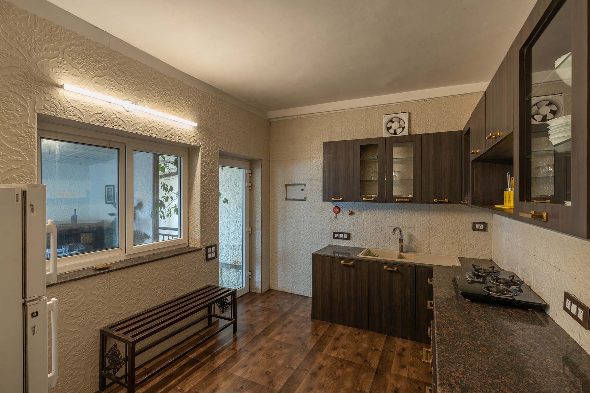 Nestled on the outskirts of the cherished hill station of Mussoorie, VODUK71 Villa is situated on a charming private road that guarantees unparalleled tranquility. The residence has been meticulously constructed from the ground up, designed to harmonize with the natural surroundings without disturbing a single tree during its development. Remarkably, despite its enveloping peace, surrounded by lush forests and breathtaking vistas, this vacation home offers excellent access to Mussoorie’s renowned attractions. The calming, muted color scheme throughout the villa beautifully complements the verdant landscape outside.