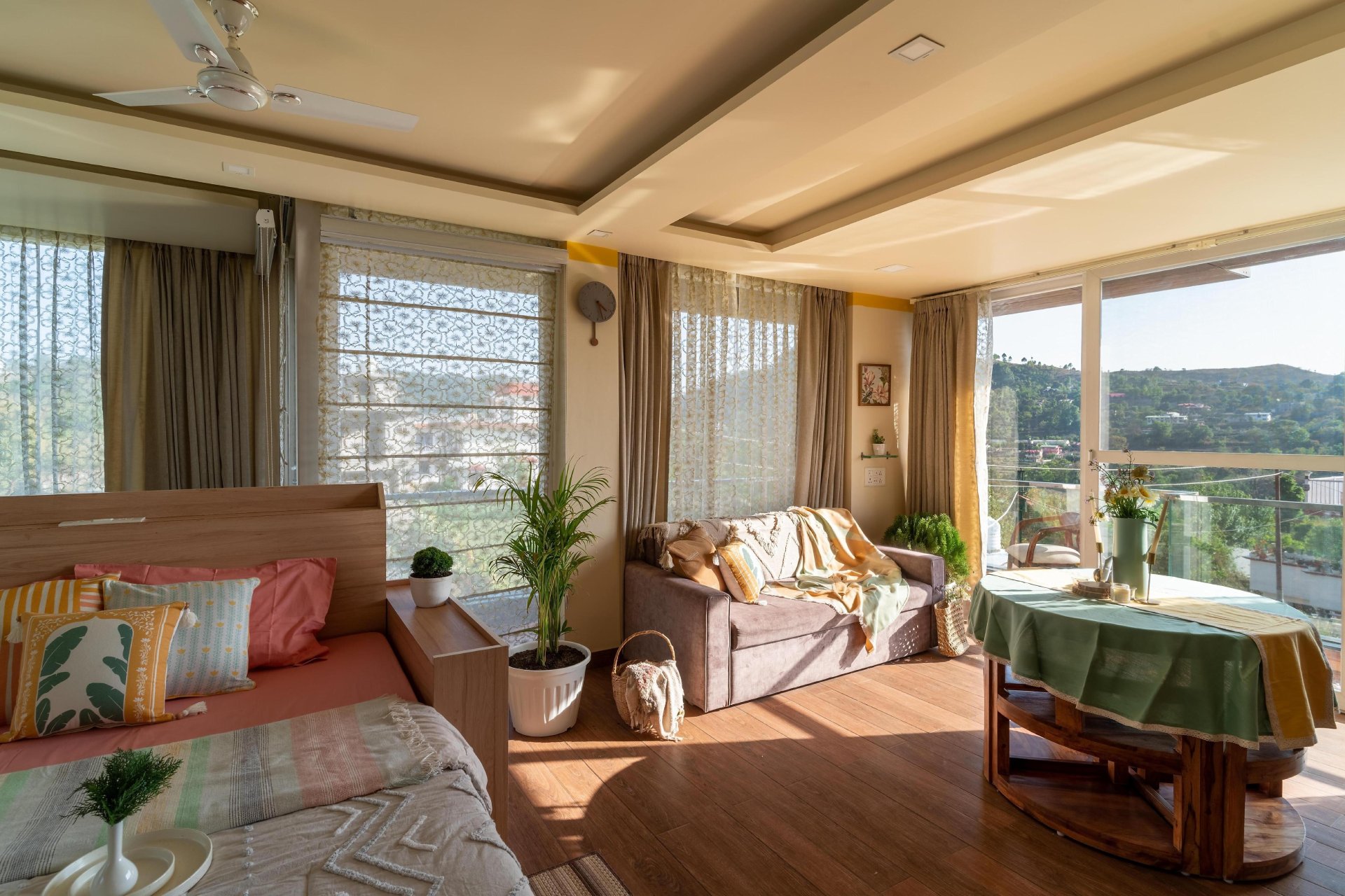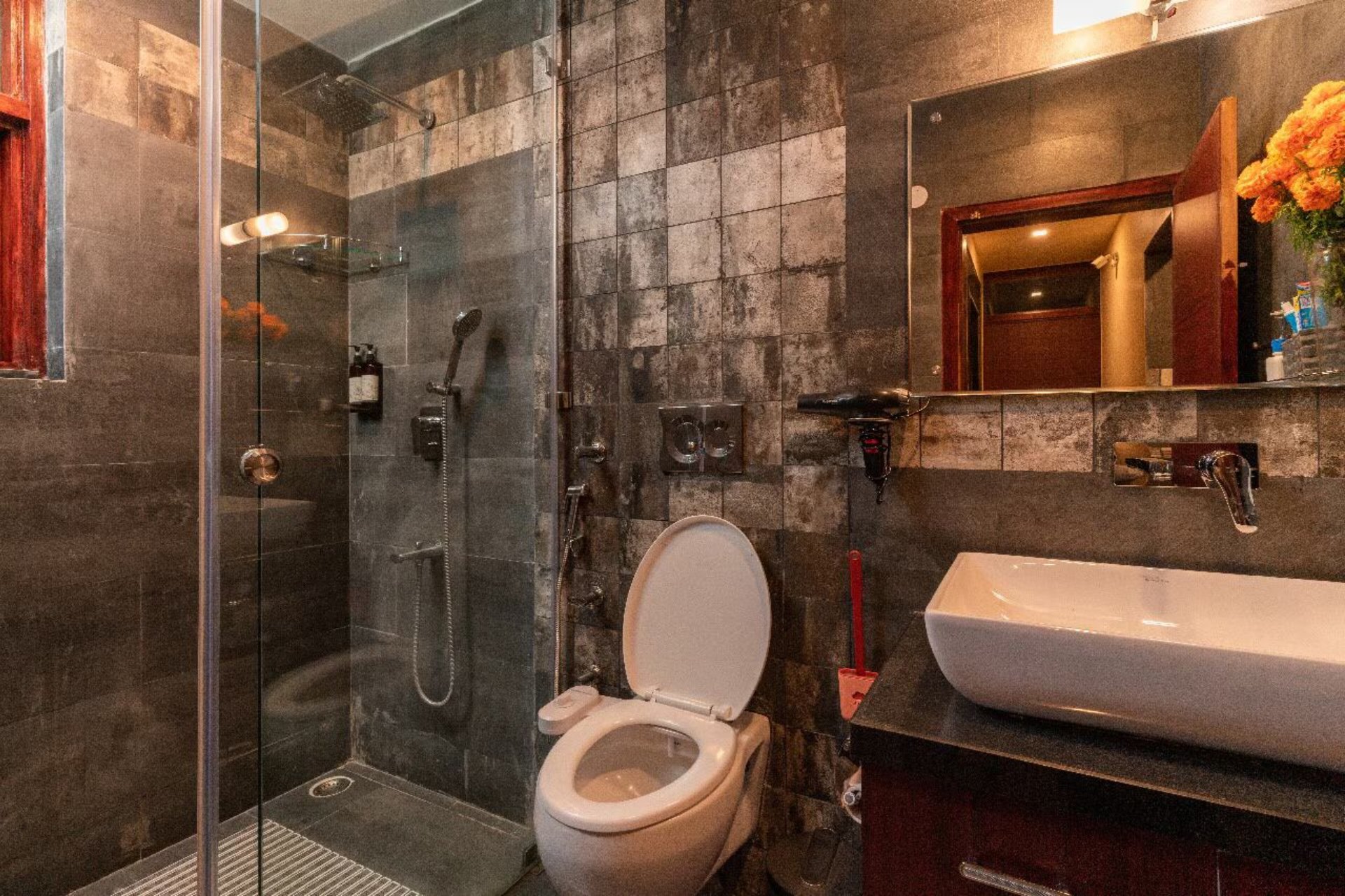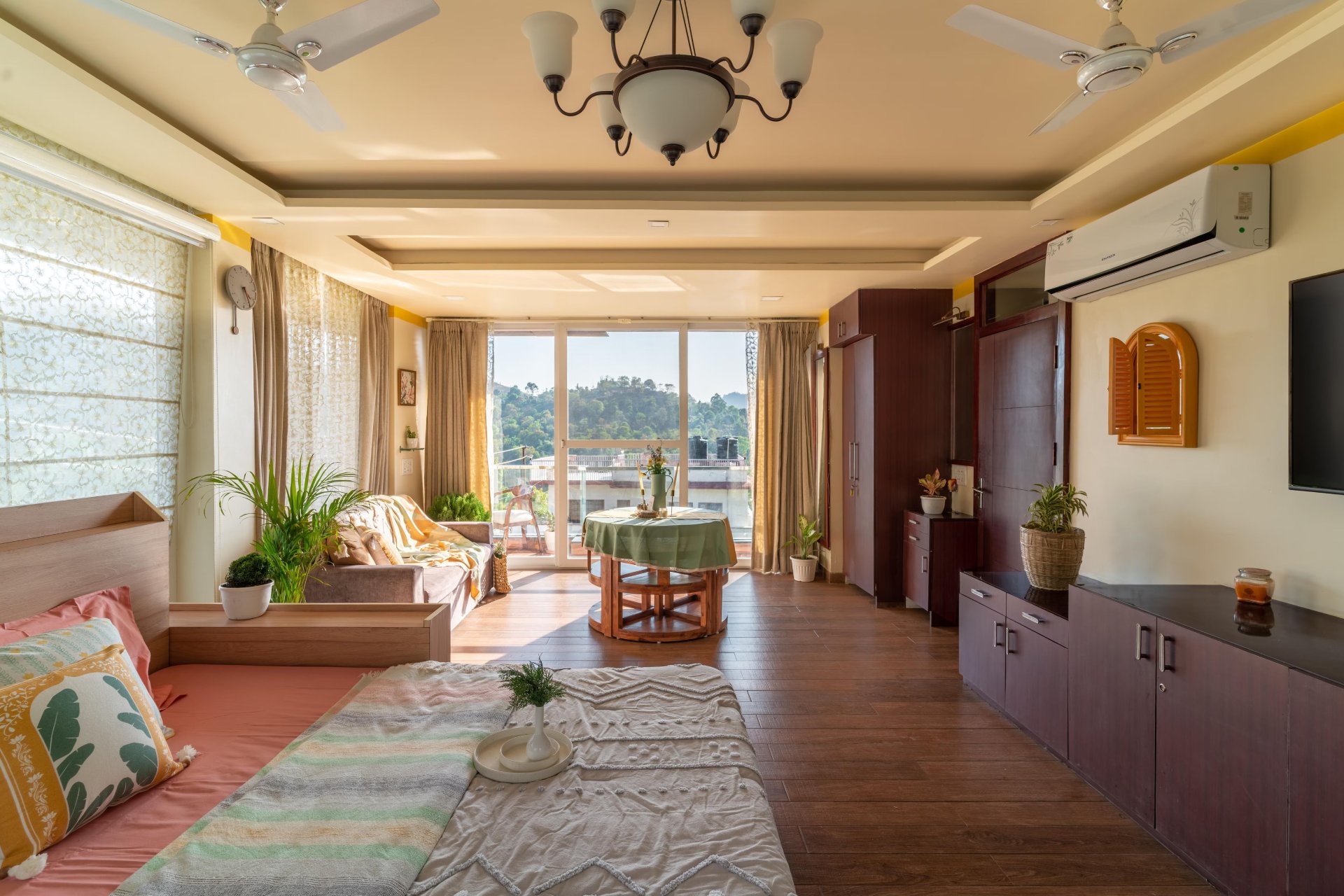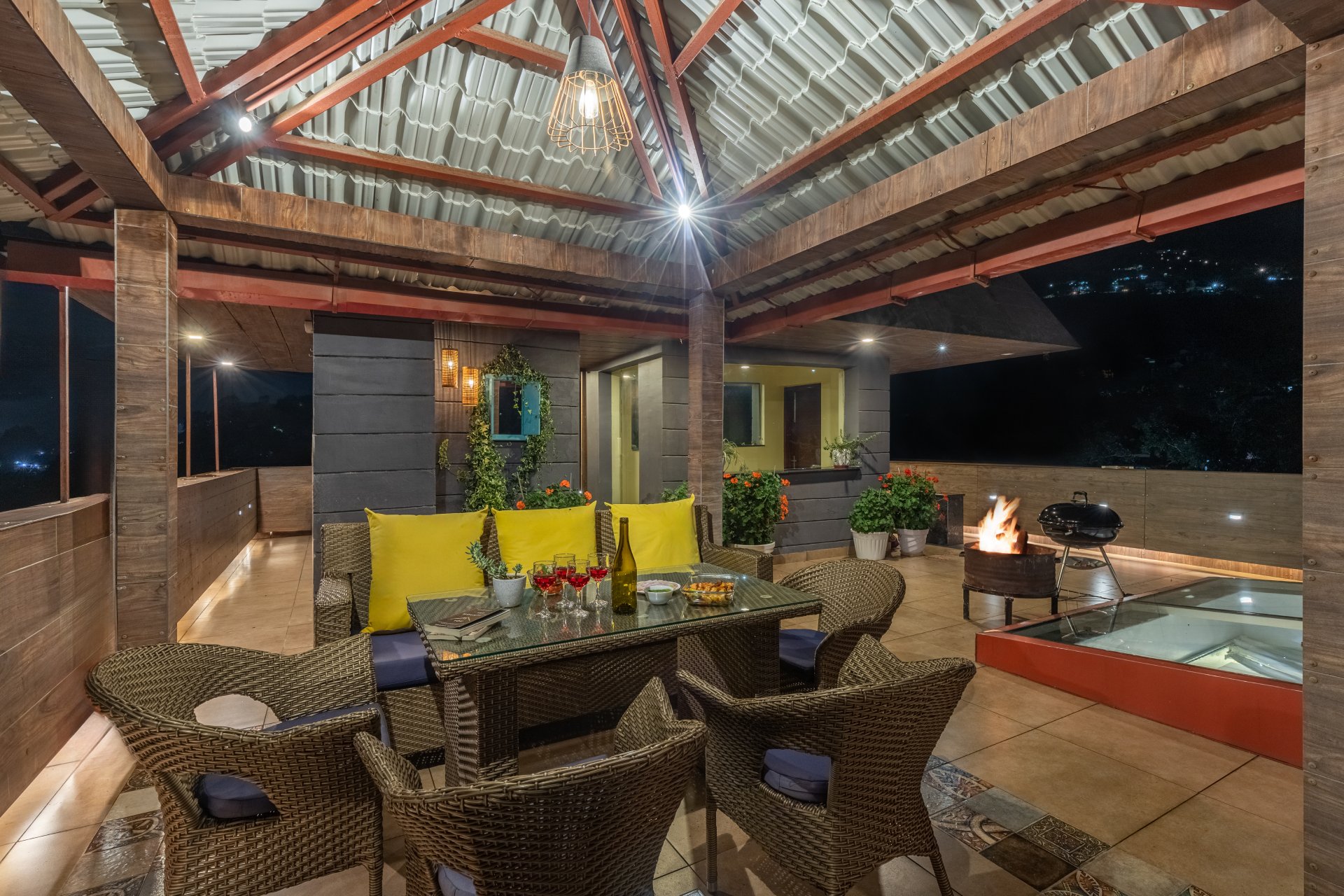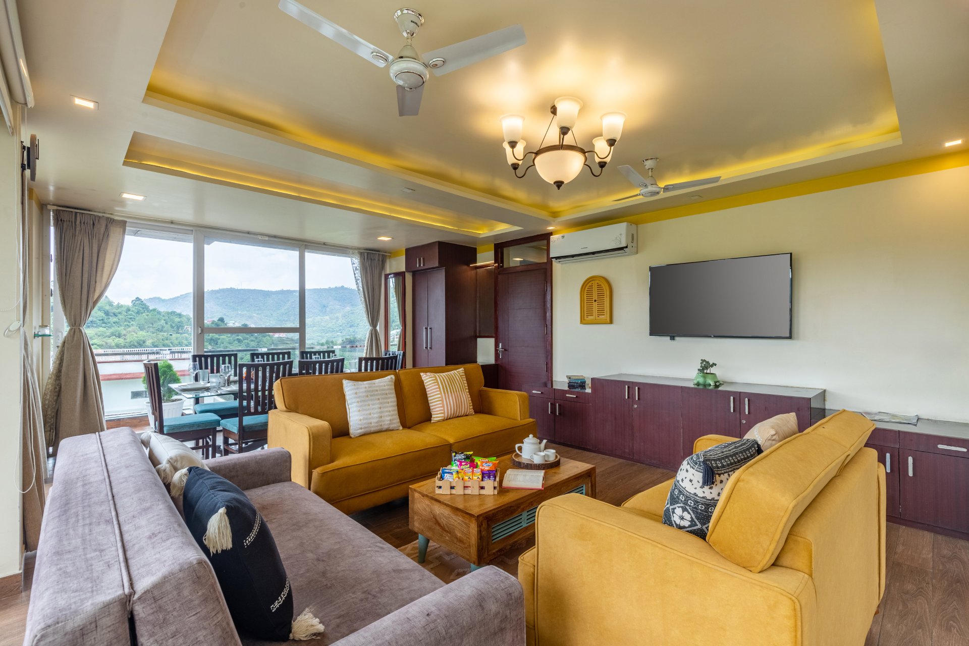 Additionally, the villa serves an à la carte or Asian breakfast. The villa features an elegant dining space and an expansive garden, perfect for hosting unforgettable evening gatherings. Guests can unwind with tea while enjoying the melodies of birds or savor wine beneath the stars, creating an ideal Himalayan retreat. Accommodations include full access to 3 bedrooms, 3 bathrooms, a powder room, and a terrace equipped with a canopy that comfortably seats 5 to 7 individuals.