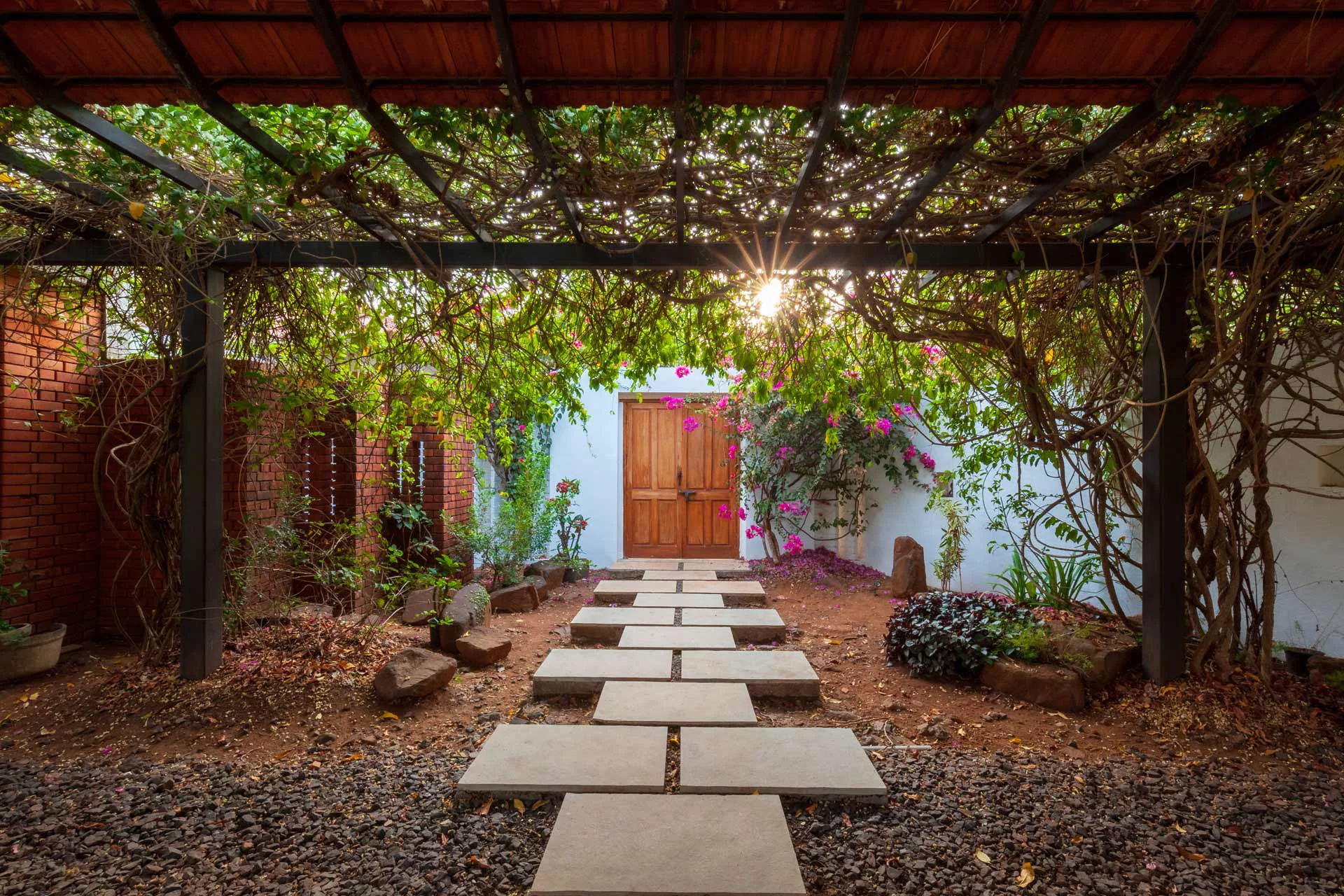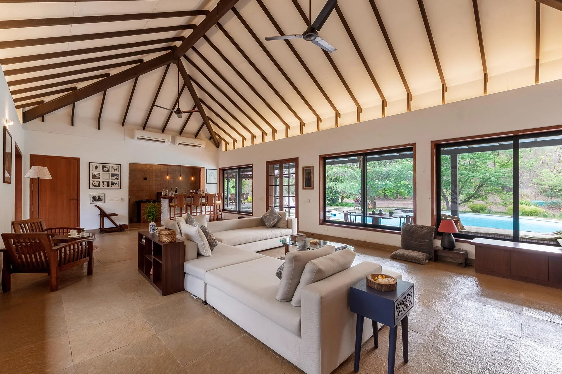 Luxury 3 BHK Pool Villa VODMH175 Villa illuminates the essence of Mumbai, transforming it into a sanctuary for the spirit. This delightful residence, designed to merge the boundaries of indoor and outdoor spaces, is centered around the traditional Indian concept of an aangan, featuring a stunning plumeria tree positioned at its heart.