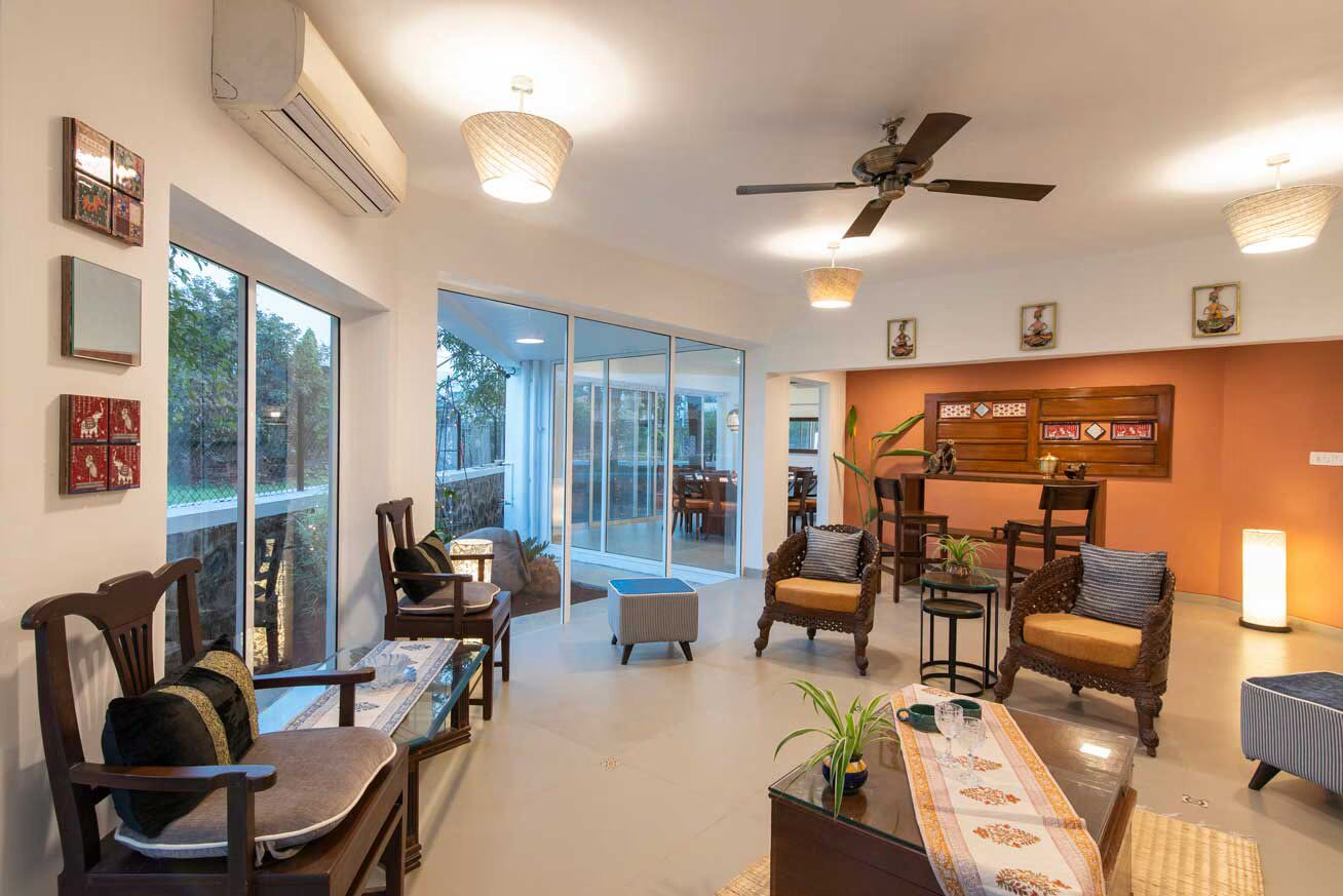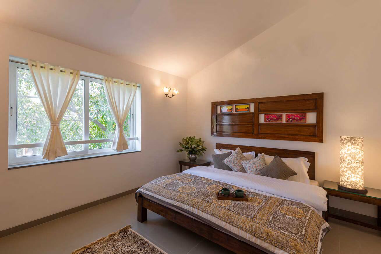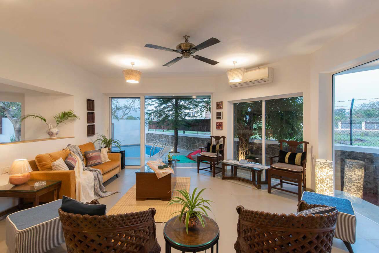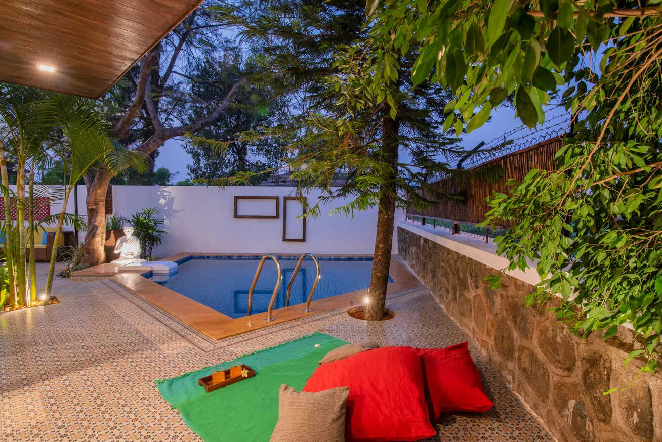 luxury 3 room plunge pool villa in lonavala This unique themed bungalow is an ideal retreat for those seeking an escape. Situated in Lonavala, this remarkable property boasts calming interiors complemented by white washed exteriors. With breathtaking views of the hills and mountains, you can immerse yourself in the idyllic scenery during your stay.
