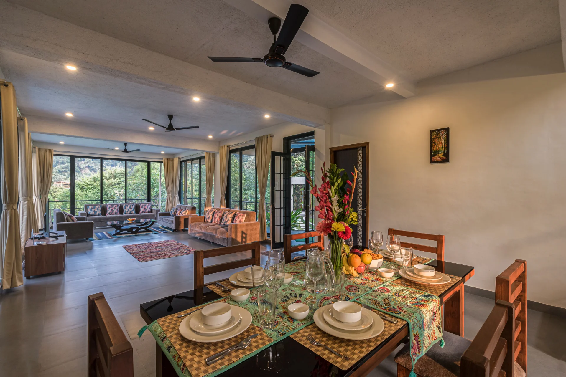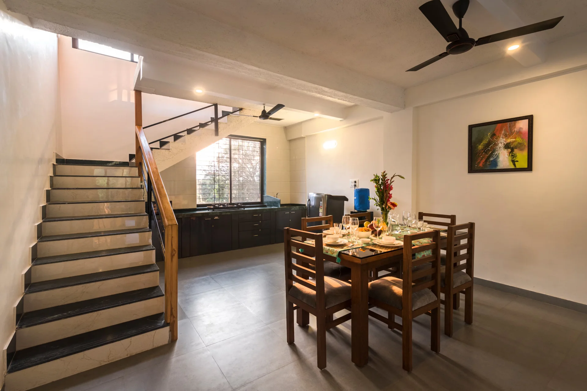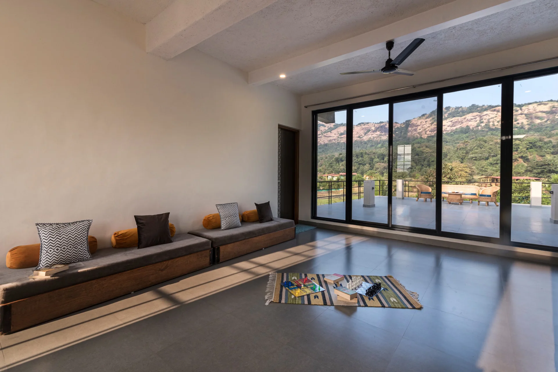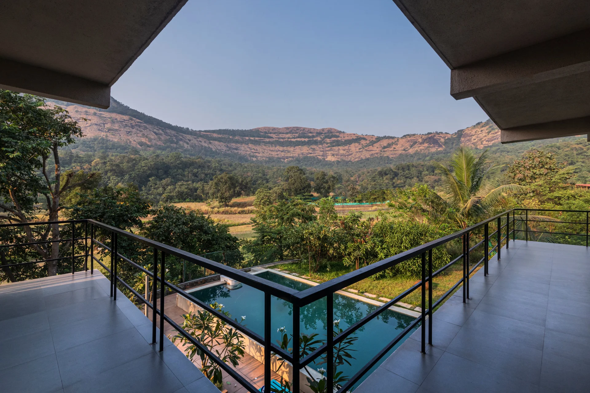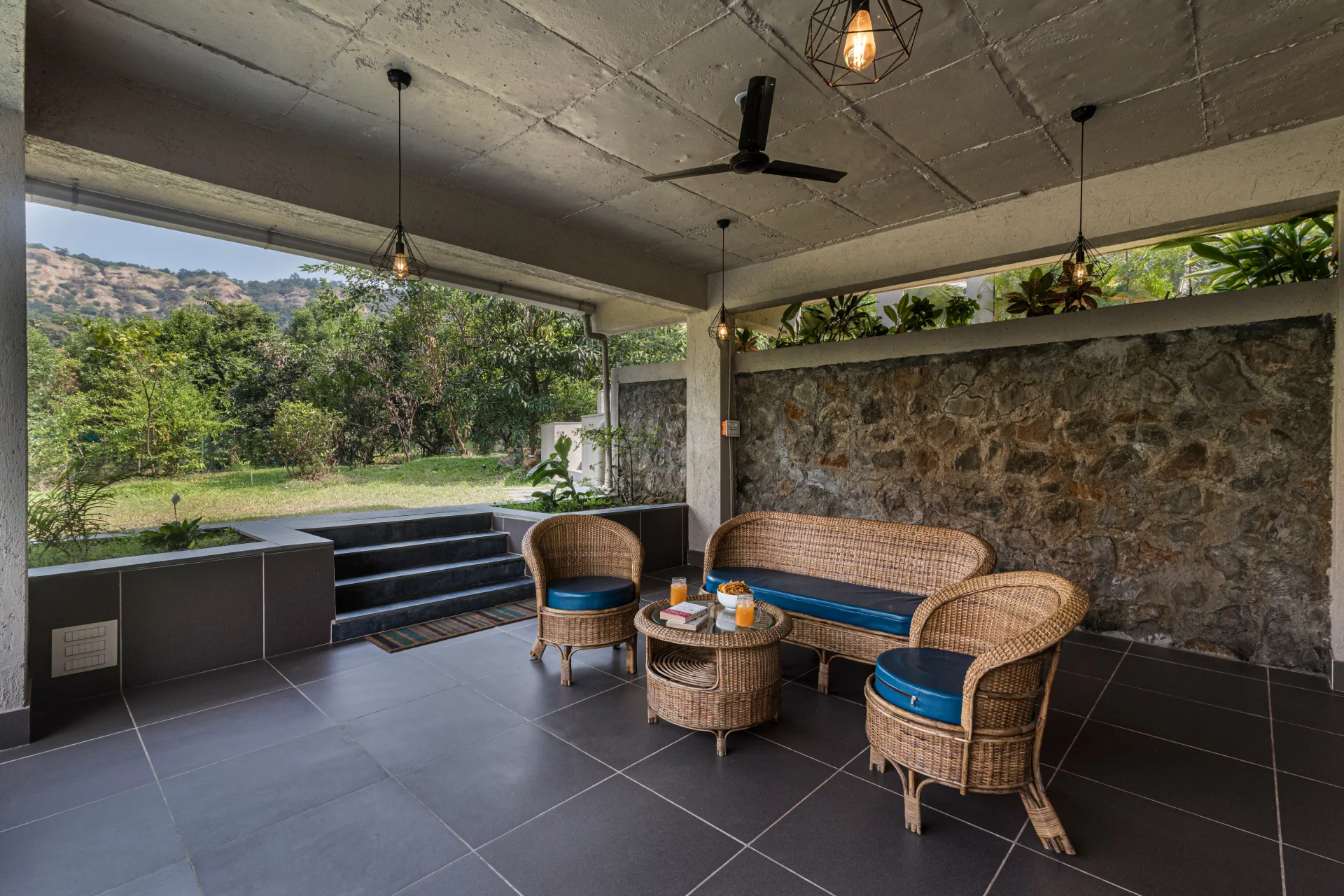 Luxury 4 Bedroom Terrace Villa In Karjat with mountain vistas and lush green lawns. Unwind with floor-to-ceiling windows, an expansive terrace, and a farm-to-table experience, offering the perfect retreat for celebrations. Challenge your friends for a round of badminton and enjoy several outdoor activities and games.
