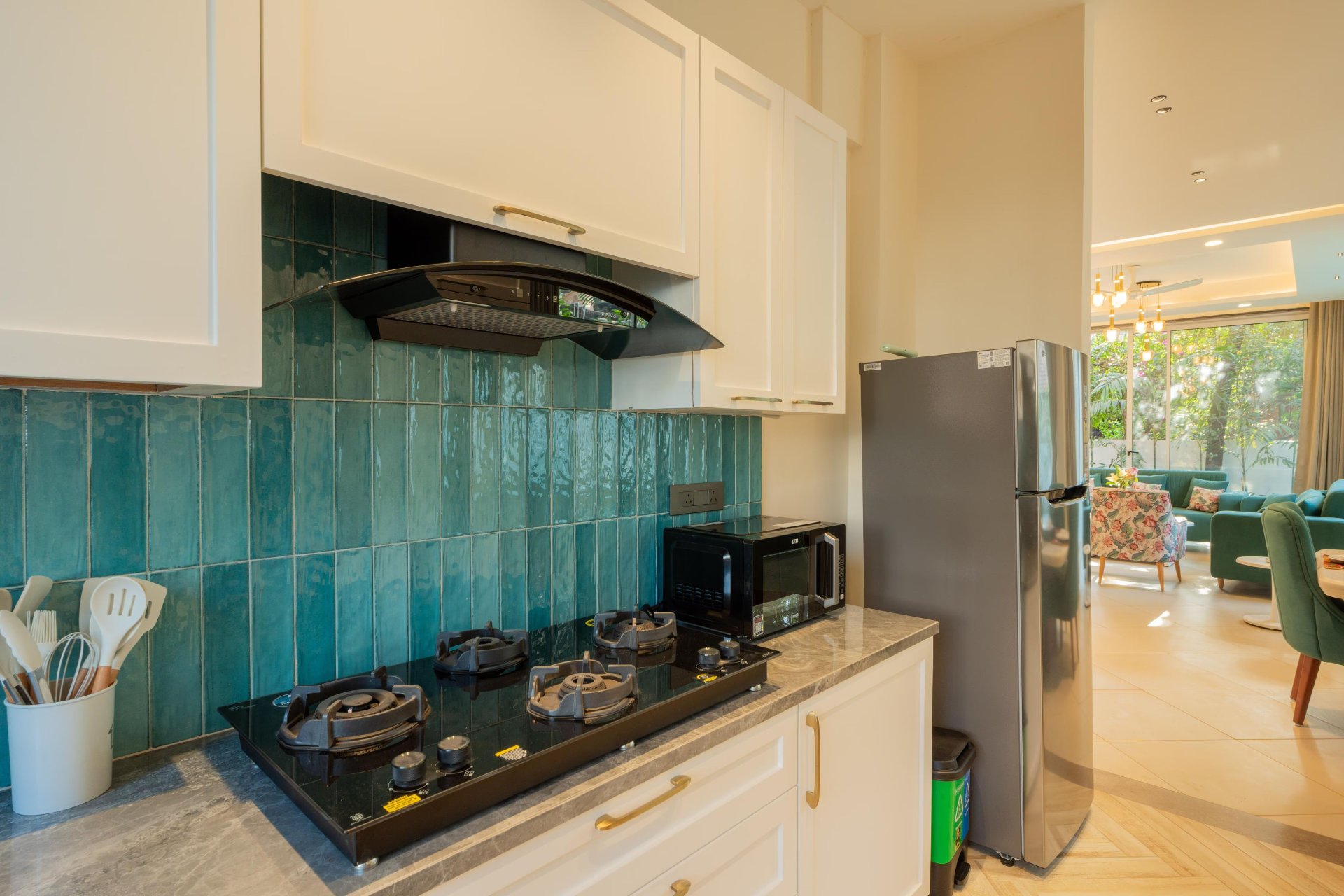 Luxury 4 Bedroom Villa In Goa Nestled within a secure gated community, this stunning villa presents an ideal combination of luxury and allure. Upon entering, you are welcomed by a living room that exudes sophistication, featuring delightful floral-patterned armchairs, and a modern wall-mounted television positioned above a lively yellow console.