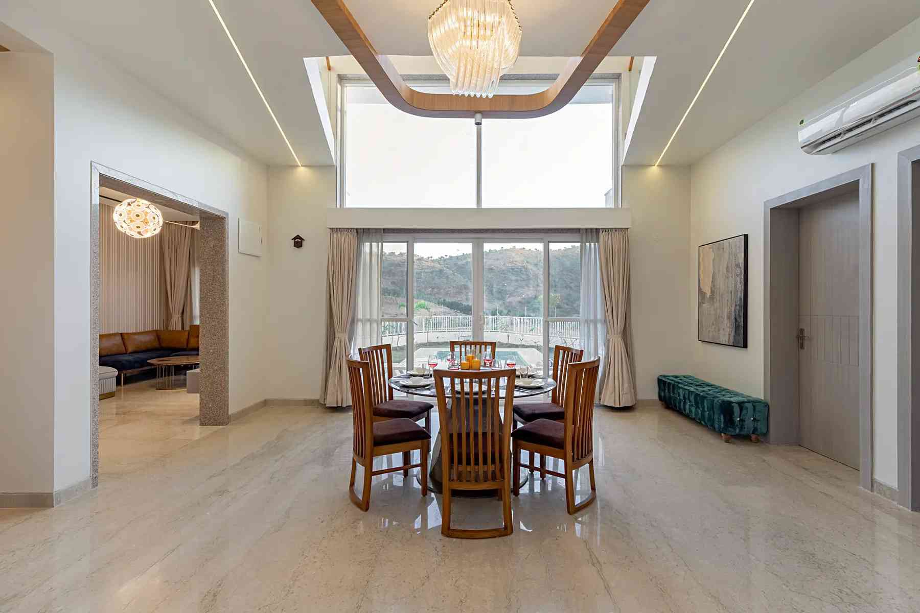 luxury 4 bhk villa with pvt pool in udaipur Situated within the serene Aravalli hills, this villa presents a perfect retreat on the fringes of Udaipur. Featuring contemporary interiors, it boasts a living room equipped with sophisticated furnishings, and stylish lighting. Outside, relax by the private pool with comfortable loungers.