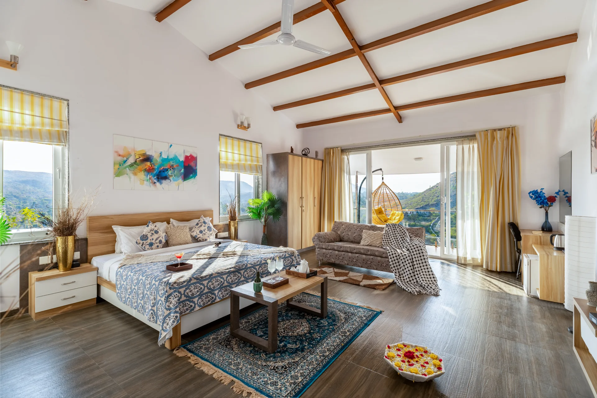 Luxury 5 Bedroom Pool Villa In Udaipur Situated 800 meters above VODRJ99 Villa, this opulent getaway presents a remarkable combination of comfort and scenic beauty. Featuring five air-conditioned bedrooms, a glass-enclosed room that offers a panoramic view of the mountains, and an infinity pool it serves as a sanctuary of serenity.