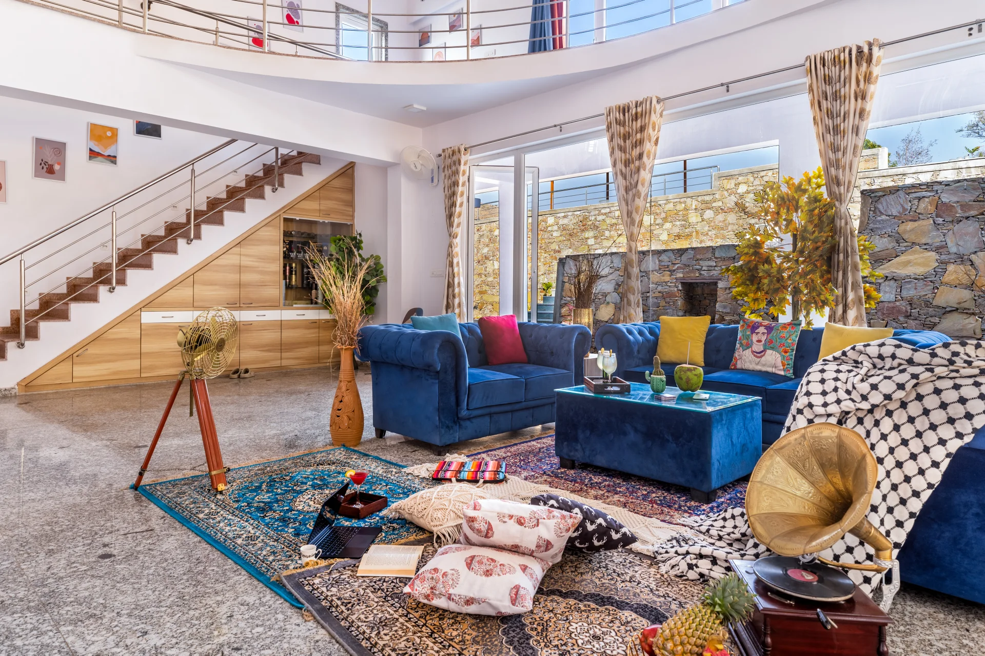 The VODRJ99 Villa Udaipur is crafted to harmonize opulence with the natural environment, offering five generously sized air-conditioned bedrooms, each equipped with an en-suite bathroom to guarantee maximum comfort and seclusion. A remarkable highlight is the glass room, which offers a captivating panoramic view of the picturesque Aravalli Hills. The duplex living area is elegantly adorned with contemporary decor, fostering a warm yet luxurious atmosphere for visitors. Experience the elegance of a duplex living room, a beautifully landscaped garden, and exquisite meals crafted by a professional chef. With two dedicated housekeeping staff providing round-the-clock service and a backup generator guaranteeing continuous power, you can fully indulge in the ultimate luxury and natural beauty of this stunning mountain retreat.