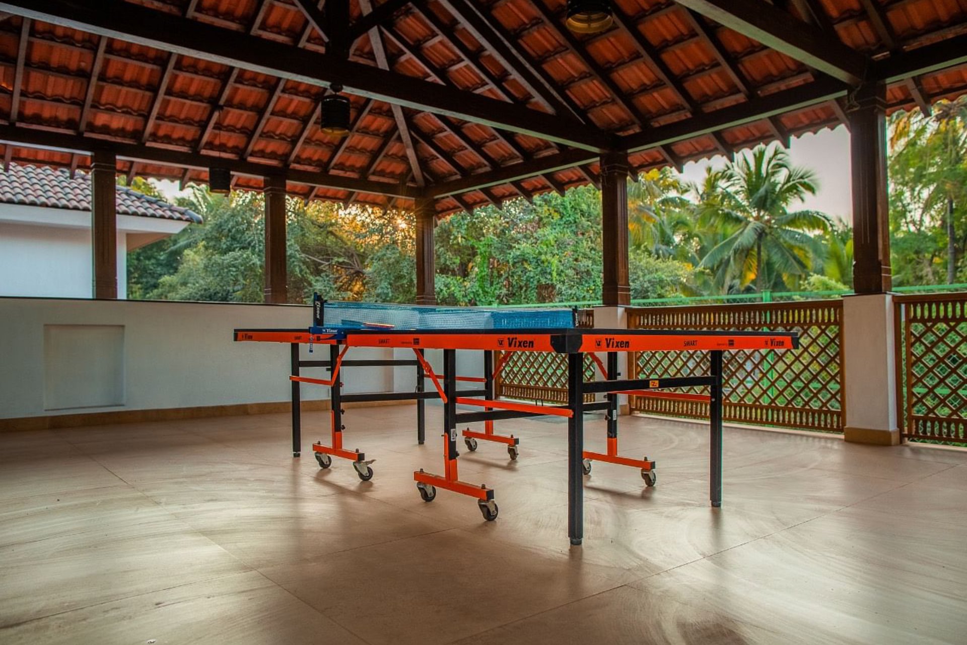 The space features contemporary art and a self-service pantry, complete with a washing machine and dryer to meet all your essential needs. A delightful wraparound verandah offers a breezy setting perfect for enjoying a leisurely afternoon with a good book. Relax by the sparkling private pool, inhale the fresh air amidst the lush greenery, and experience a blend of sophistication and comfort. Towering palm trees, along with mango, lemon, and chikoo trees, create a picturesque environment adorned with exotic flowers and buzzing bees, making this a truly idyllic retreat for guests. This property in North Goa is conveniently situated near numerous tourist attractions, with the beach just a short 2-3 minute walk away.