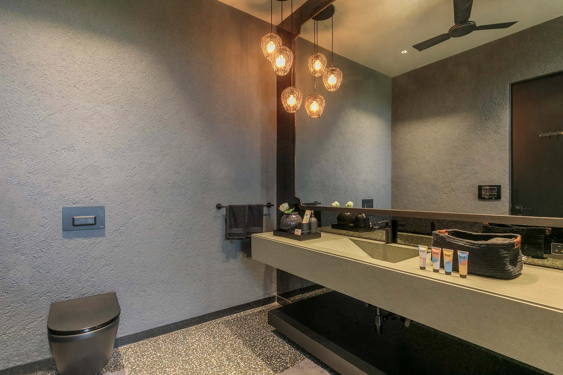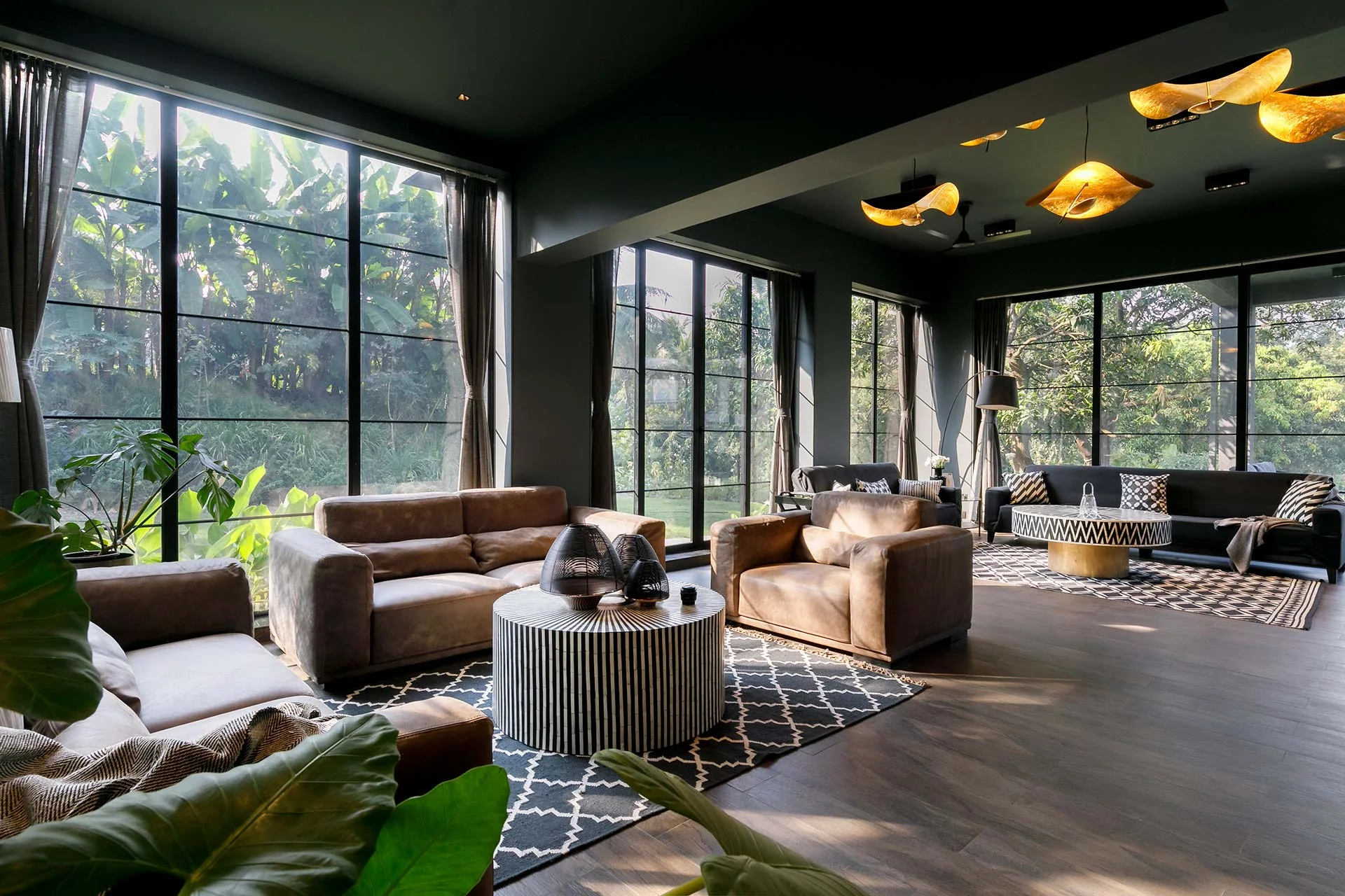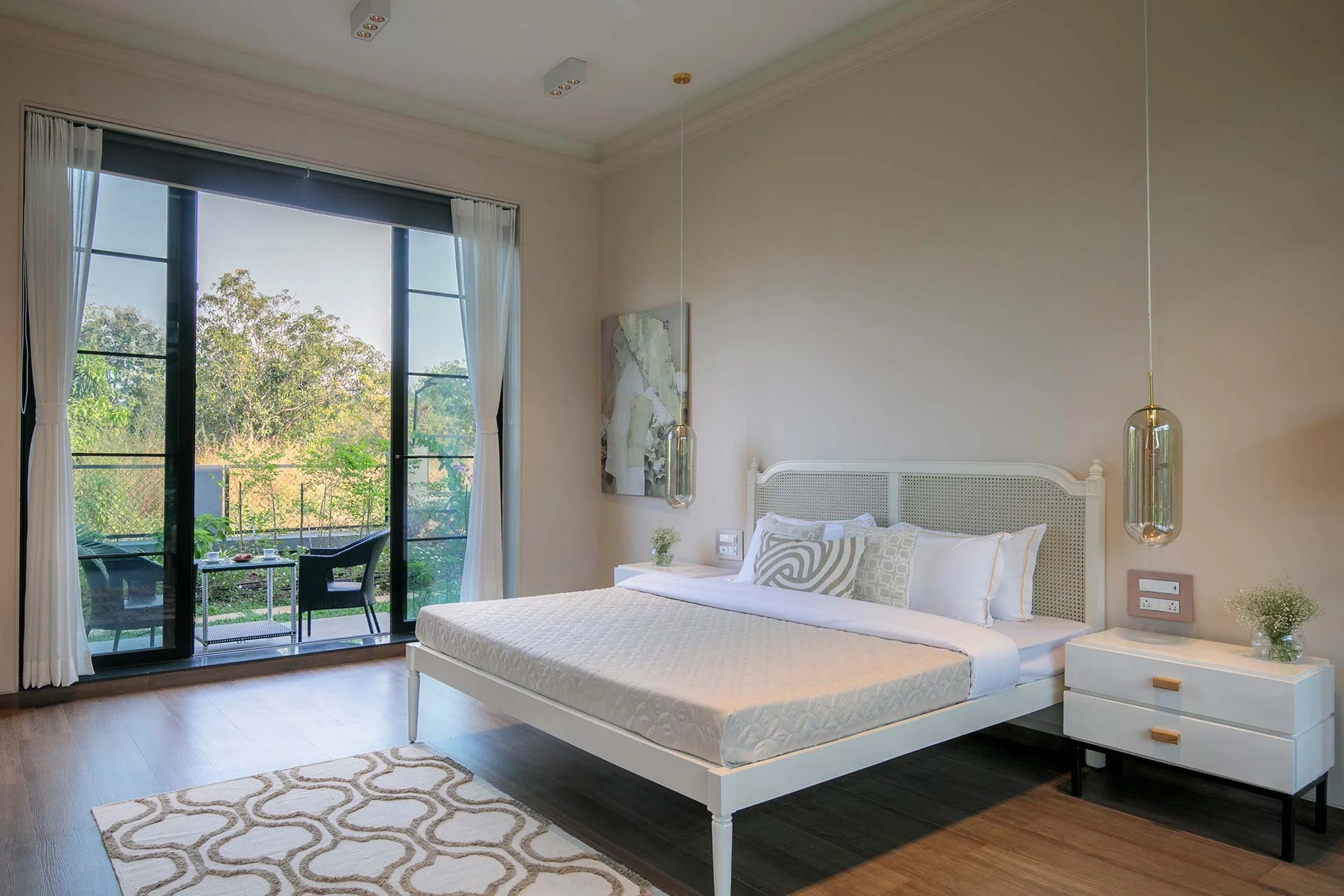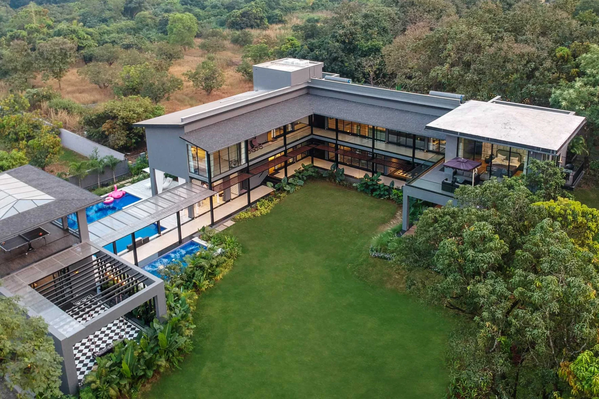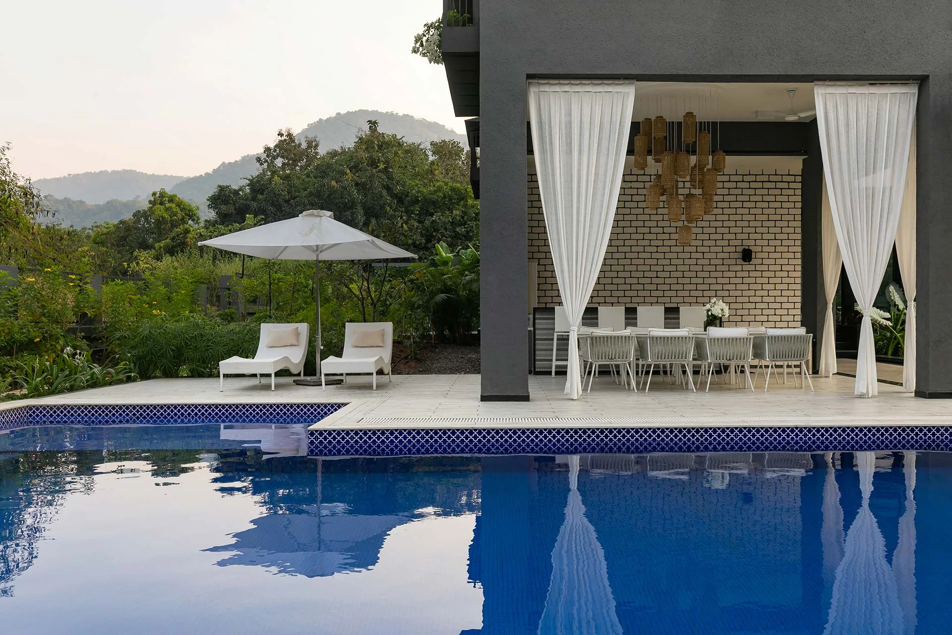 The distinctive U-shaped design of this luxurious retreat offers views of the tranquil emerald surroundings from every room, as the residence is enveloped by lush, thriving greenery. The numerous custom experiences will captivate you – whether it is the private swimming pool, the jacuzzi, the terrace, or the deck. However, our favorite area here is the hidden garden – a cozy and inviting corner surrounded by plants, furnished with wooden benches that sparkle in the evening light. With its elegant style and myriad experiences, one thing is certain – this opulent home will leave you yearning for more. Located 80 km from Chhatrapati Shivaji International Airport Guests appreciate the scenic views and proximity to local activities.